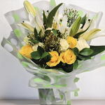 Radiante y alegre, este ramo combina el brillo alegre de las rosas amarillas con la pura elegancia de los lirios blancos. Es un regalo perfecto para levantar el ánimo de alguien, celebrar una ocasión feliz o simplemente aportar un toque de sol a cualquier habitación. Para mantener tu ramo fresco, coloca los tallos en agua limpia y fresca y cambia el agua a diario. Recorta los tallos en diagonal cada 2–3 días y retira las hojas que queden por debajo de la línea del agua. Mantén el ramo en un lugar fresco, alejado de la luz solar directa, el calor y las corrientes de aire.