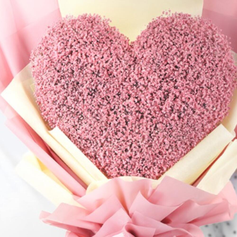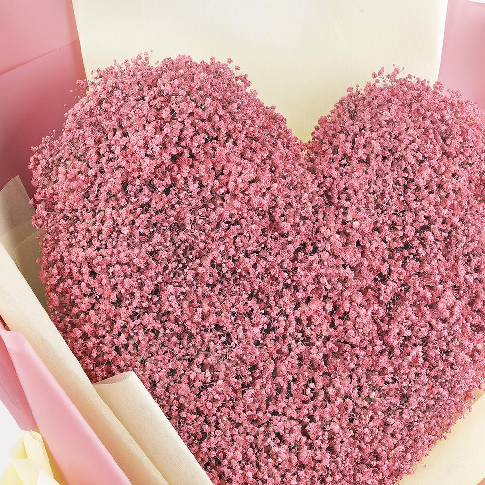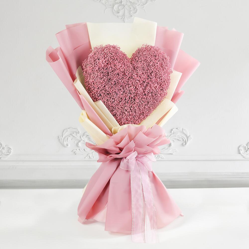 Celebra los momentos preciados con tu ser querido regalándole este impresionante ramo. Envuelto en una delicada envoltura rosa se encuentra un oasis en forma de corazón de paniculata rociada en rosa que sin duda hará sonrojar. La paniculata está meticulosamente dispuesta, formando un corazón que refleja tu amor y adoración por esa persona. Este ramo es un regalo perfecto para amigos y familiares en ocasiones especiales, garantizando que crees un día memorable y lleno de alegría para tus seres queridos.