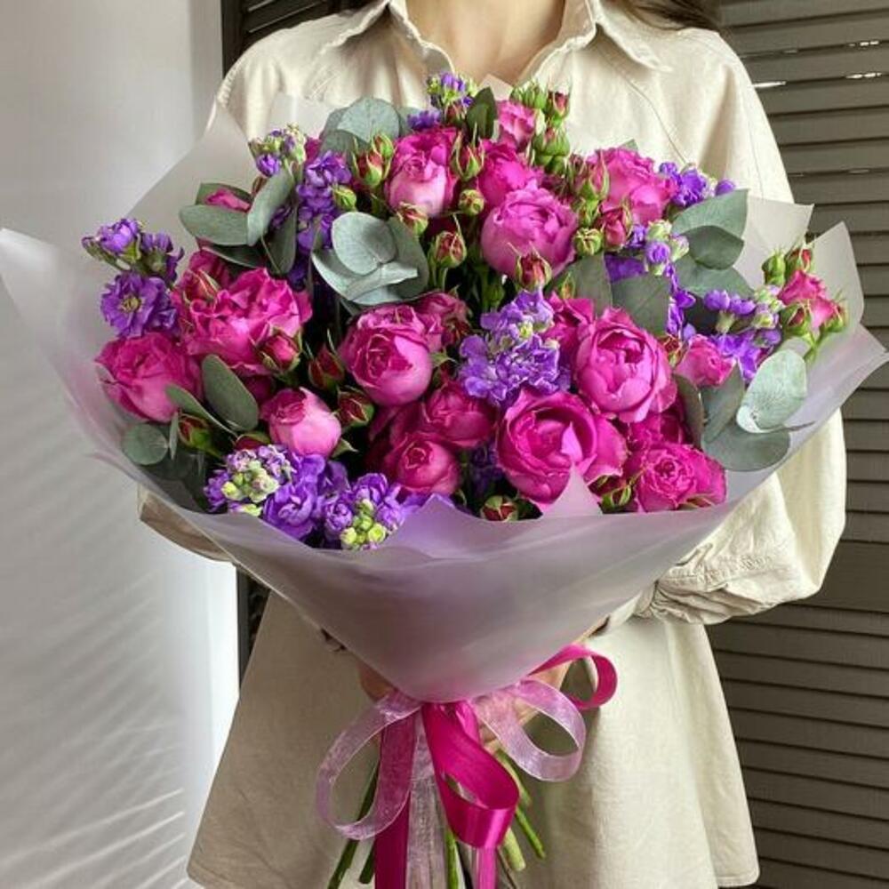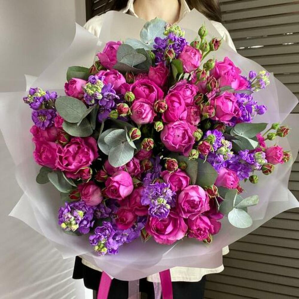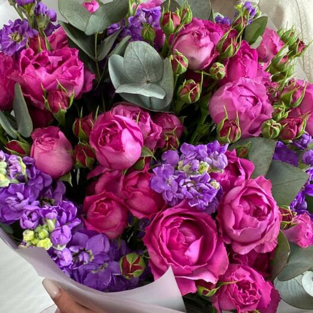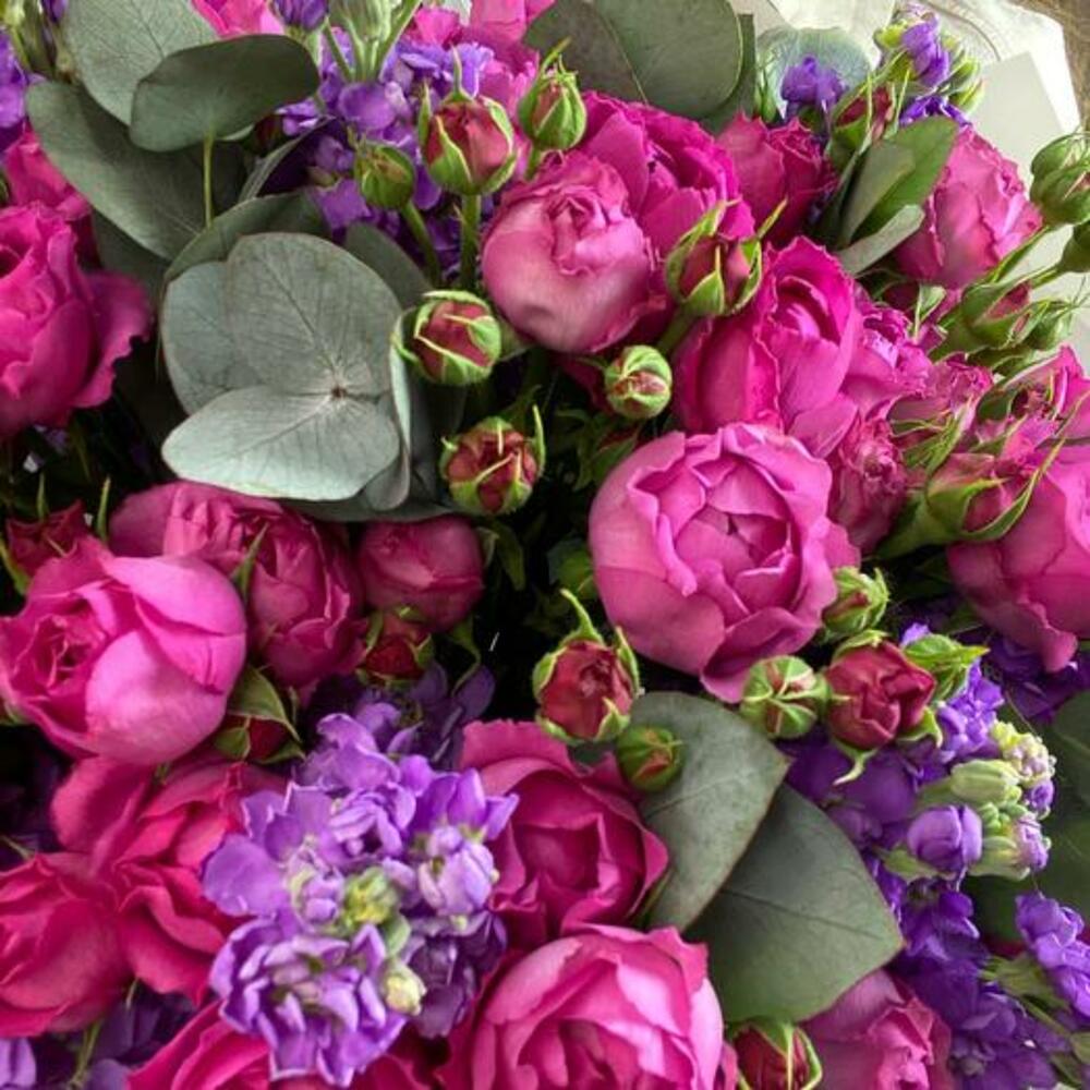 Eucalyptus - 3 ud. matthiola - 9 ud. design packaging - 1 ud. rosa spray peonía - 10 ud.