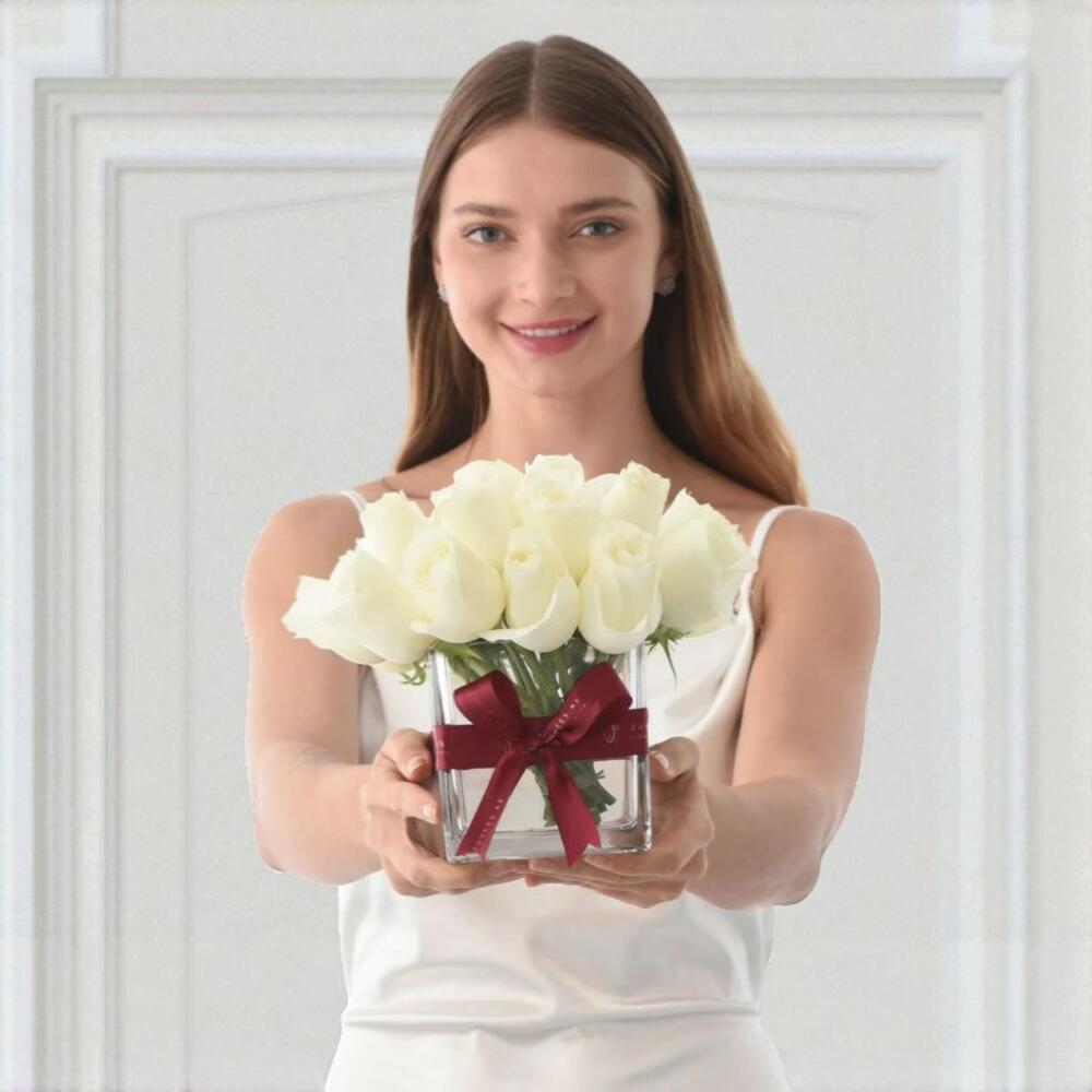 Expresa con gracia el amor, la admiración y la elegancia atemporal con el combo Eternal White en jarrón de vidrio con pastel, un clásico regalo floral diseñado para inspirar serenidad y calidez. Con 21 rosas blancas prístinas, dispuestas artísticamente en un jarrón de vidrio transparente de 12x12 cm y atadas con una rica cinta carmesí, este conjunto irradia pureza y sofisticación. Para completar la celebración, el combo incluye un decadente pastel de chocolate de medio kilogramo y un alegre globo dorado con la inscripción «Feliz Cumpleaños» — convirtiéndolo en el regalo todo en uno perfecto para alegrar, honrar o sorprender a alguien especial.