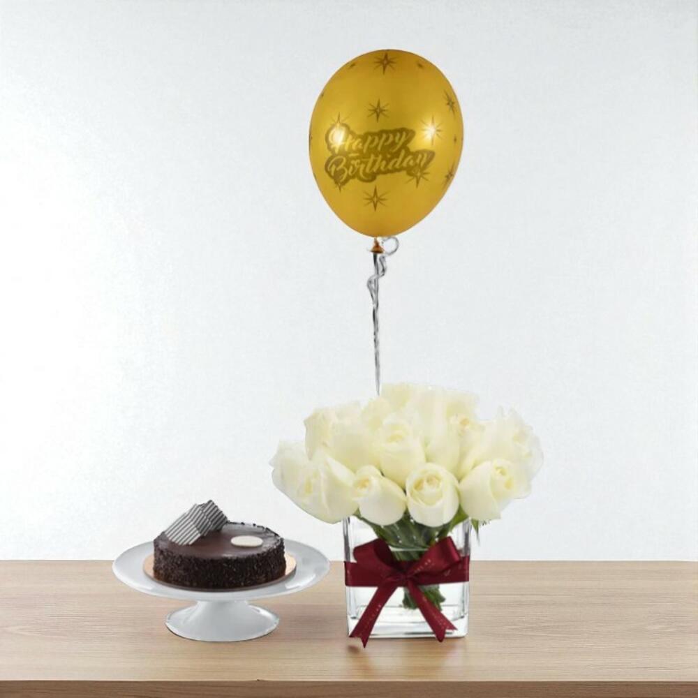 rosas blancas frescas - 21 ud. pastel de chocolate de medio kg - 1 ud. globo dorado “feliz cumpleaños” - 1 ud.