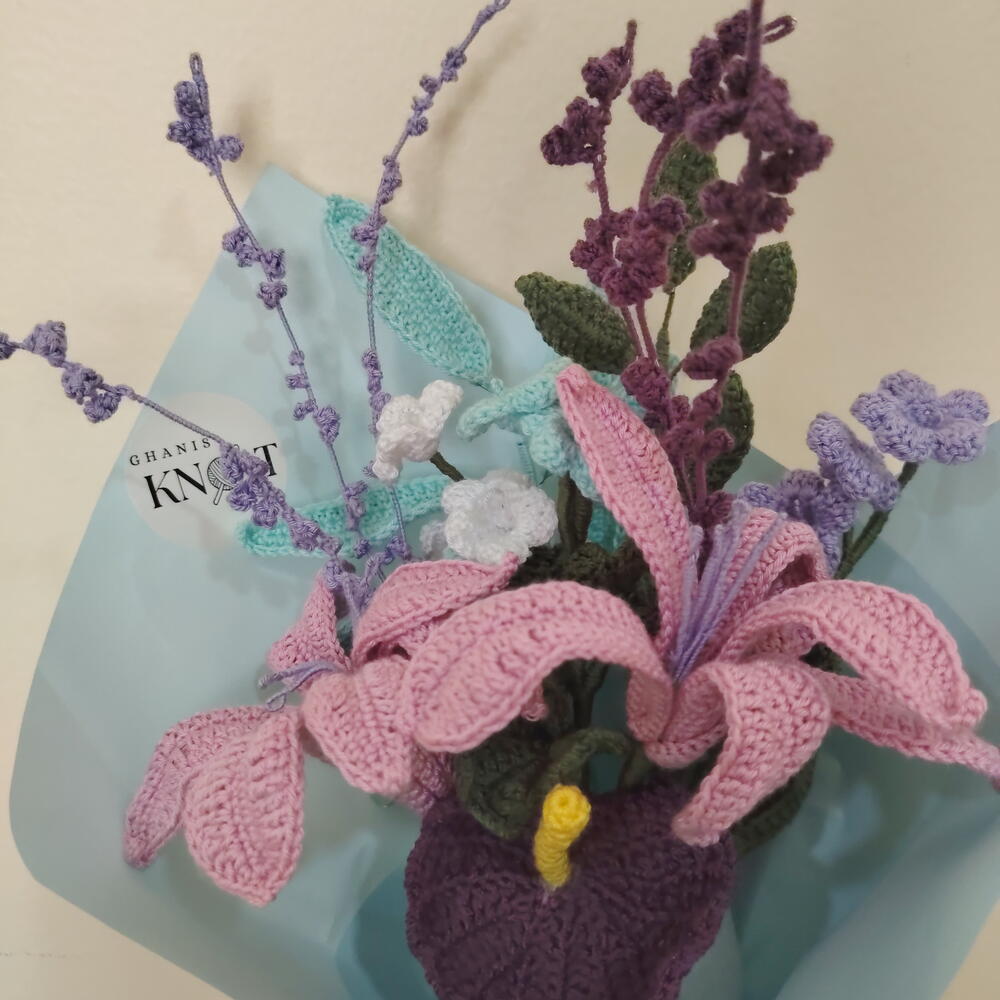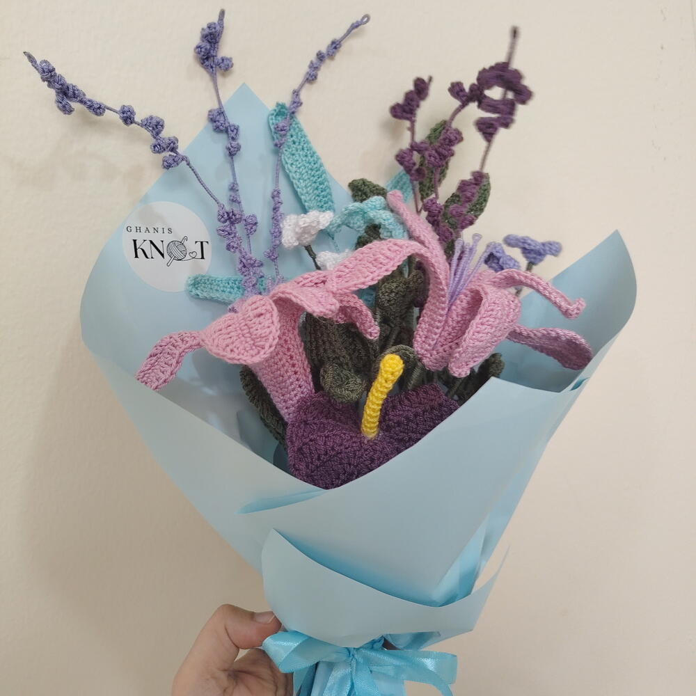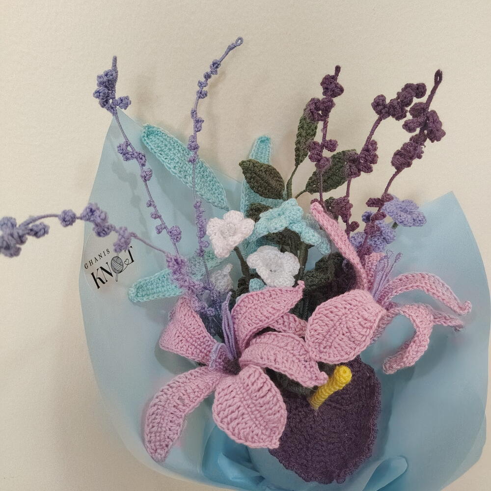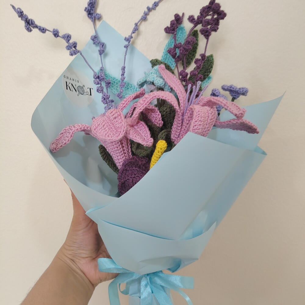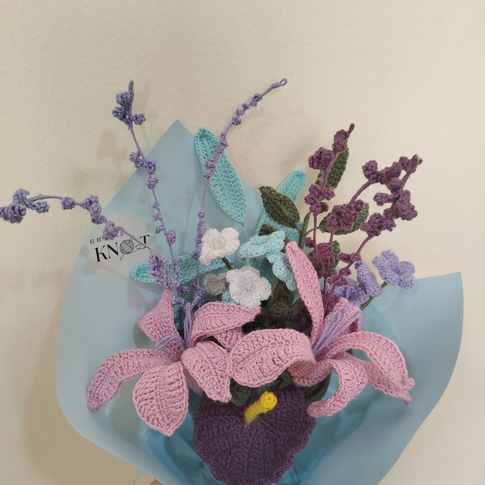 Gift a bloom that lasts a lifetime. This exquisite, 100% handmade crochet bouquet is the perfect alternative to fresh flowers. Meticulously crafted with premium yarn, this arrangement features elegant pink lilies, deep purple focal blooms, and delicate lavender sprigs. It offers the beauty of a garden with none of the maintenance. Why Choose This Bouquet? Eternal Beauty: These flowers will never wilt, serving as a permanent memory of your special occasion. Hypoallergenic: Perfect for hospital visits, offices, or homes with pets and pollen sensitivities. Artisanal Quality: Each petal is individually hand-stitched with care, making every bouquet a unique work of art. Ready to Gift: Professionally wrapped in aesthetic pastel paper and finished with a coordinating satin ribbon. Specifications: Materials: High-quality cotton/acrylic blend yarn, floral wire (for posing stems). Occasions: Ideal for Birthdays, Anniversaries, Mother’s Day, or as a unique "Get Well Soon" gesture.