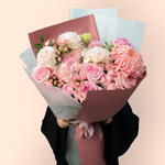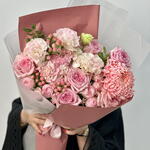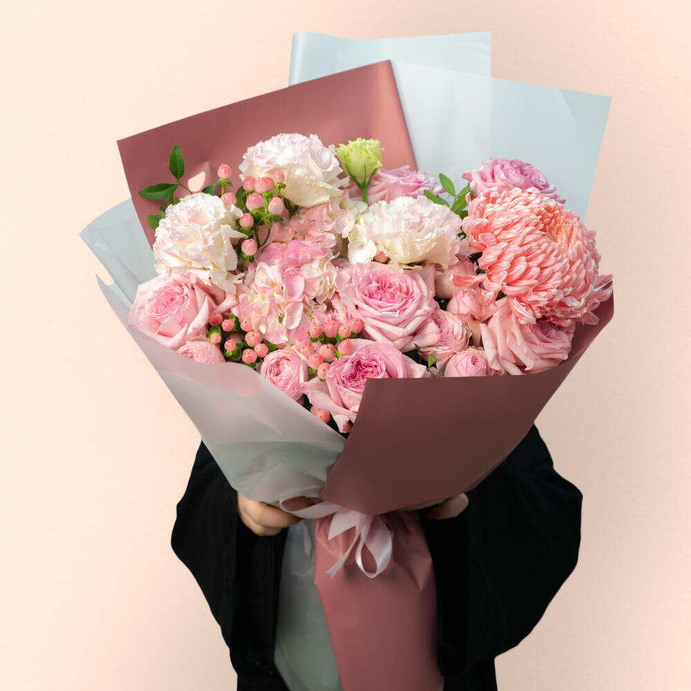 Este impresionante ramo es una delicada sinfonía de tonos rosa suaves y texturas exuberantes. Un único crisantemo deco rosa sirve como un llamativo punto focal, rodeado por las ricas y abundantes flores de hortensia rosa, rosas Ohara en rosa y rosas Julliet en rosa. El elegante lisianthus rosa y el encantador hypericum rosa añaden profundidad y carácter, mientras el follaje de pistacia se entrelaza en el arreglo, realzando su belleza natural. Envuelto en una sofisticada mezcla de rosa malva y blanco translúcido, este ramo exuda elegancia y romanticismo, haciéndolo el regalo perfecto para cualquier ocasión especial.