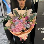 rosa púrpura intenso - 6 ud. Alstroemeria - 5 ud. Pink rose - 1 ud. Lisianthus - 5 ud. rosa melocotón - 2 ud. hydrangea mix - 1 ud. mezcla de eucalipto - 3 ud. mattiola - 5 ud. dianthus teñido espacial - 5 ud. rosa spray burbujas brumosas - 1 ud. importación estática - 1 ud. papel para envolver flores - 1 ud.