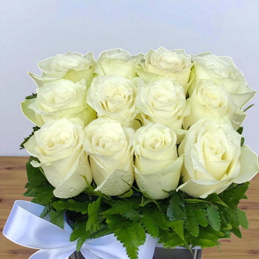 Felicity: 12 tallos de rosas blancas en un jarrón cúbico La belleza de las rosas blancas es incuestionable. Representando la inocencia, su versatilidad las convierte en un regalo favorito para felicitar por una graduación, un compromiso, una despedida de soltera, la llegada de un nuevo bebé o incluso como regalo de condolencia.