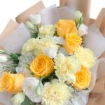 Gypsophila - 5 ud. white hydrangea - 1 ud. claveles amarillos - 8 ud. rosas blancas - 10 ud. rosas amarillas - 5 ud.