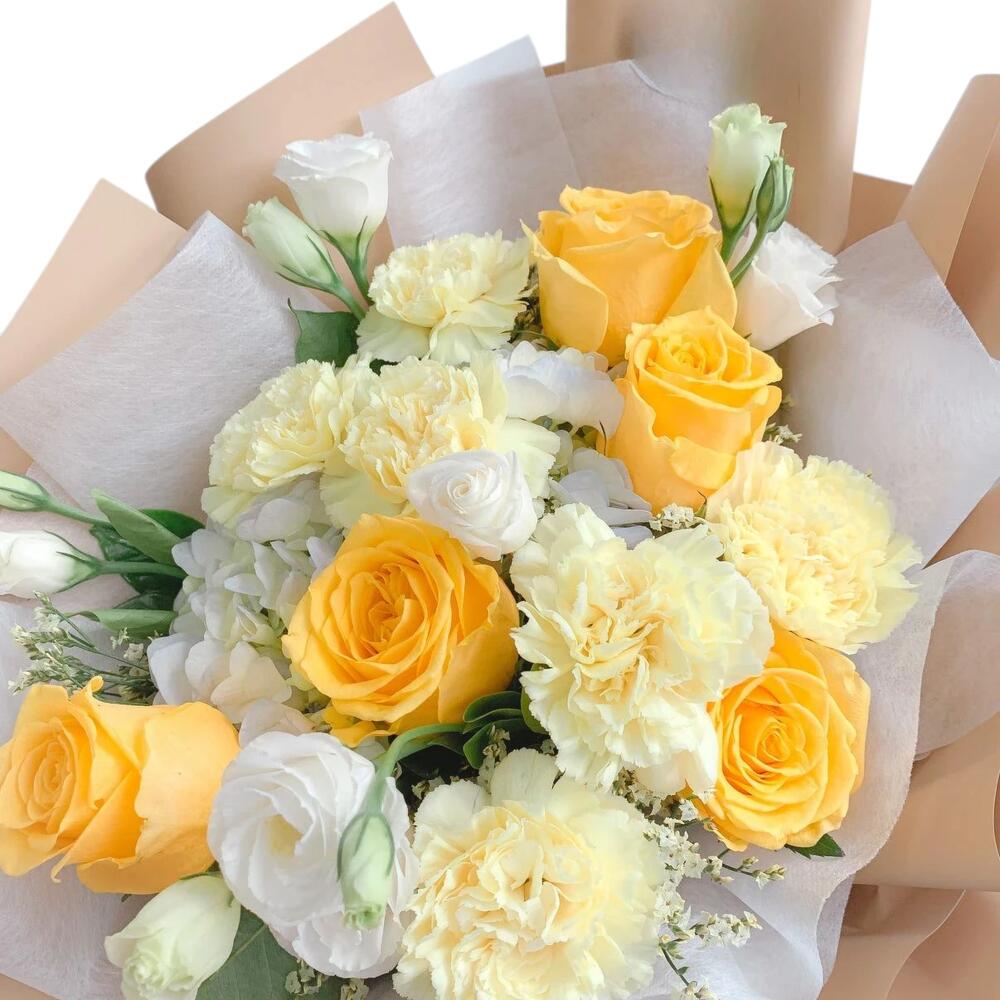 Gypsophila - 5 ud. white hydrangea - 1 ud. claveles amarillos - 8 ud. rosas blancas - 10 ud. rosas amarillas - 5 ud.