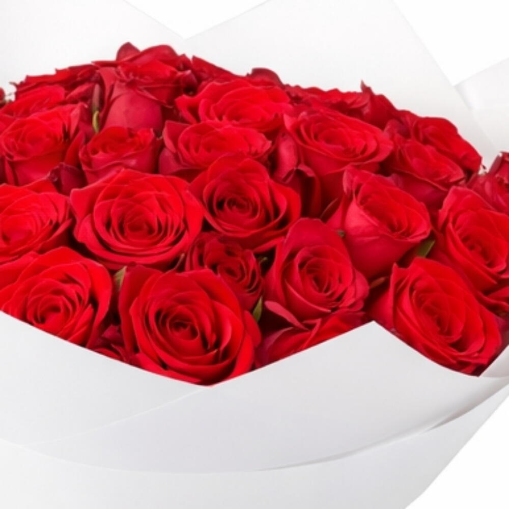 Rosas Rojas de Amor Envueltas en Blanco Este arreglo lujoso y cautivador es una expresión atemporal de romance, elegancia y profundo afecto. Con un imponente arreglo de rosas rojas aterciopeladas, frescas y seleccionadas a mano, este ramo está diseñado para impresionar con su color vibrante y su rico simbolismo.