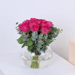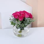 20 rosas fucsia dentro de una esfera llena de agua, un hermoso arreglo