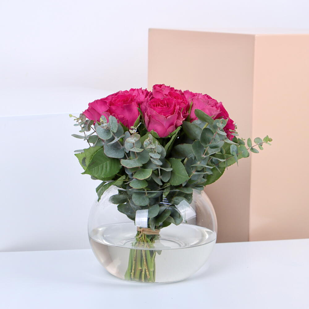 20 rosas fucsia dentro de una esfera llena de agua, un hermoso arreglo