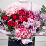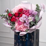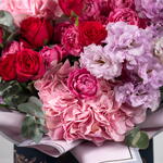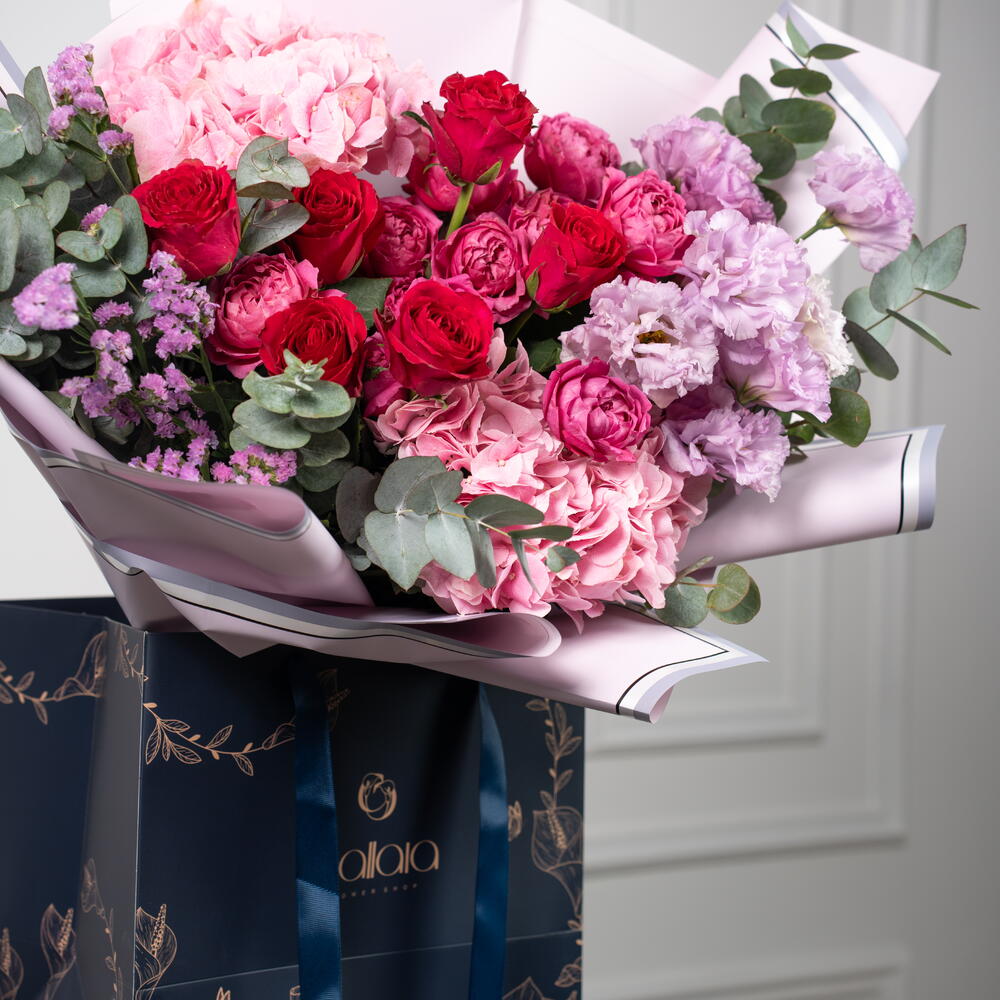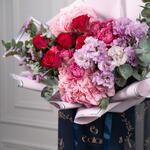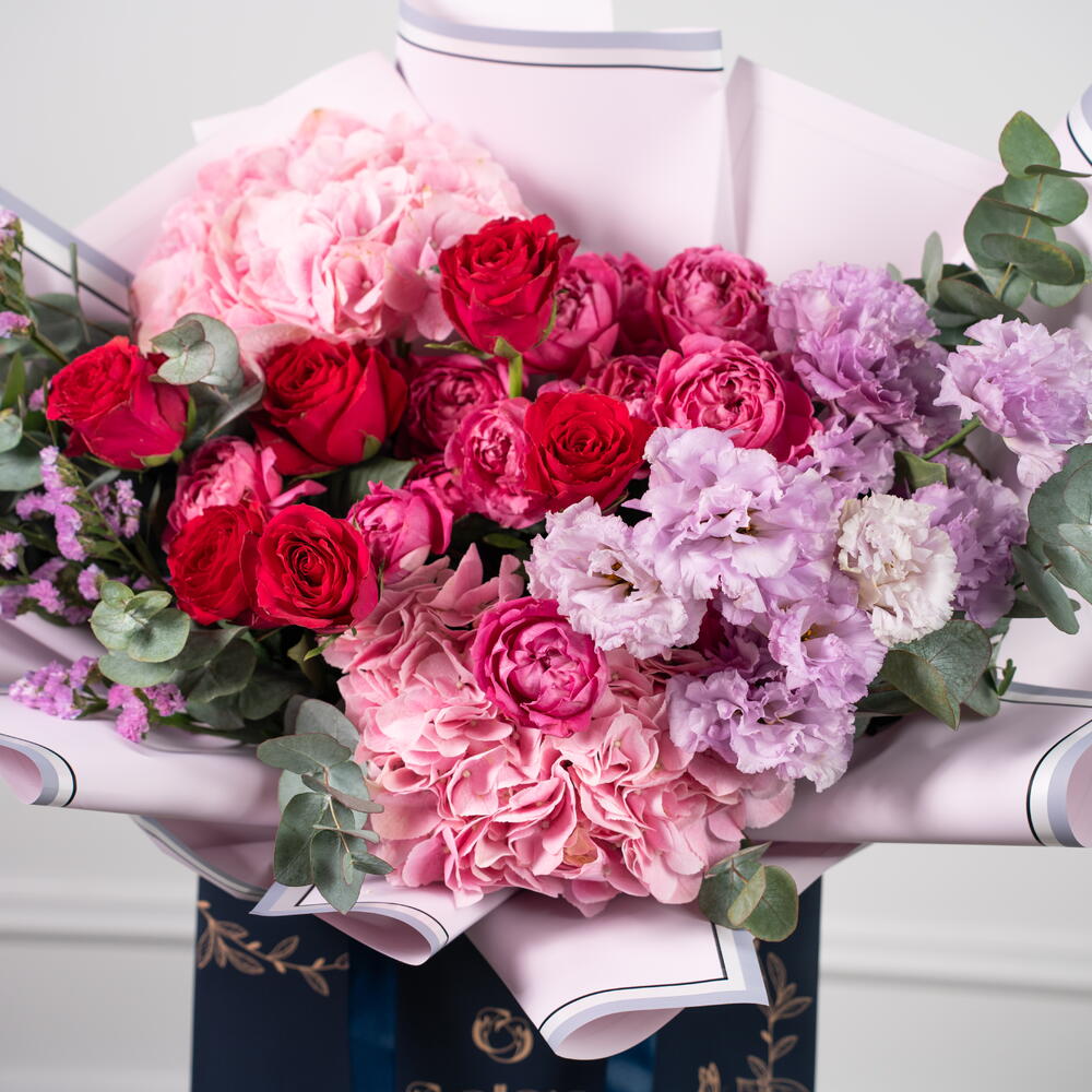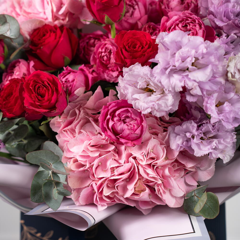 hydrangea pink - 2 ud. statice rosa - 3 ud. eustoma púrpura - 4 ud. rosa spray julietta - 3 ud. rosas fucsia - 6 ud. eucalipto - 4 ud.