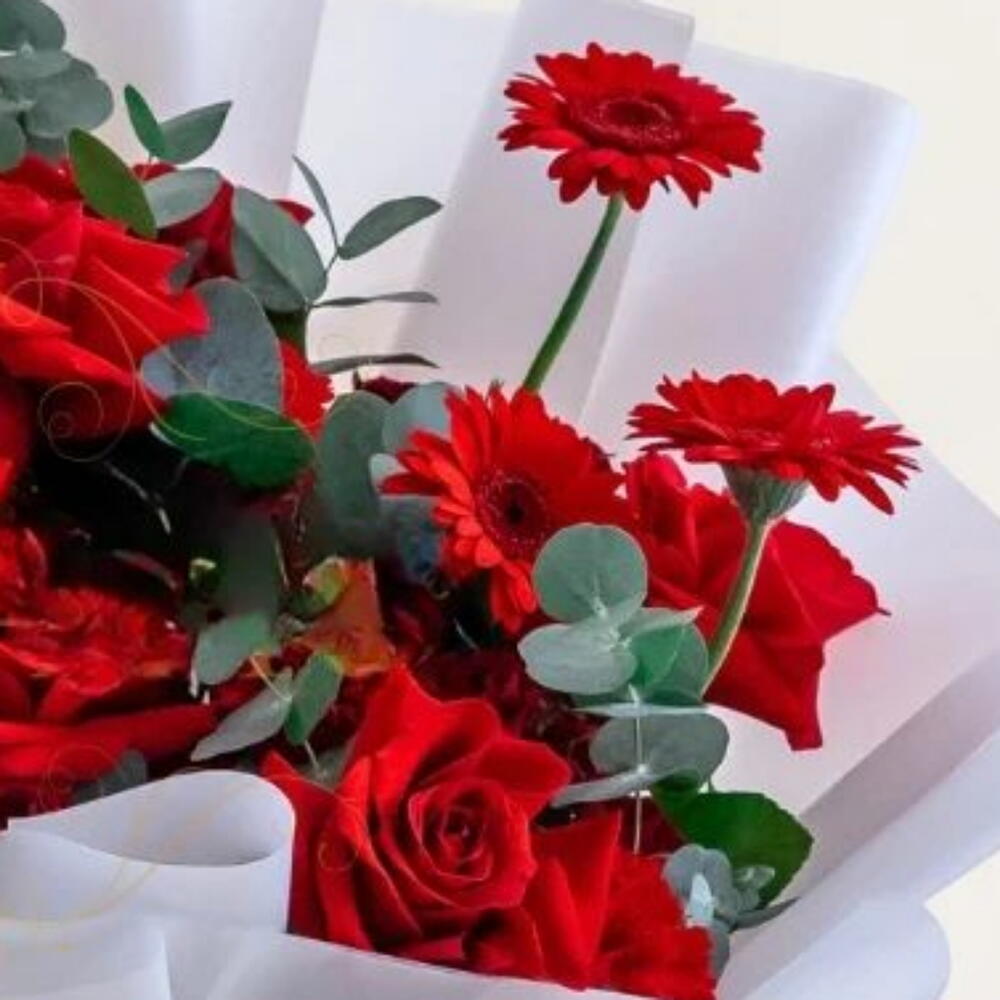 Este es un hermoso ramo de flores rojas, compuesto por rosas rojas y gerberas rojas, acentuado con follaje verde. El ramo está envuelto en papel blanco crujiente y atado con un lazo de raso blanco, creando una presentación clásica y elegante. El color rojo intenso de las rosas y las gerberas simboliza el amor romántico, la pasión y el afecto. Este tipo de ramo suele elegirse para ocasiones especiales como el Día de San Valentín, aniversarios o gestos románticos.