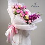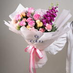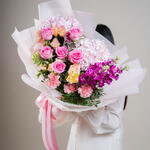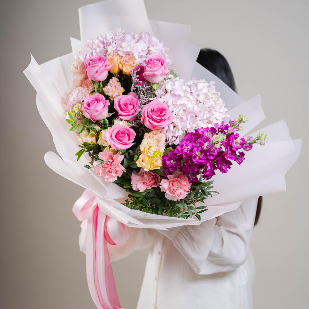 Limonium - 1 ud. eustoma melocotón - 4 ud. carnation pink - 3 ud. rosa revival - 6 ud. hydrangea light pink - 2 ud. matthiola fucsia - 3 ud.