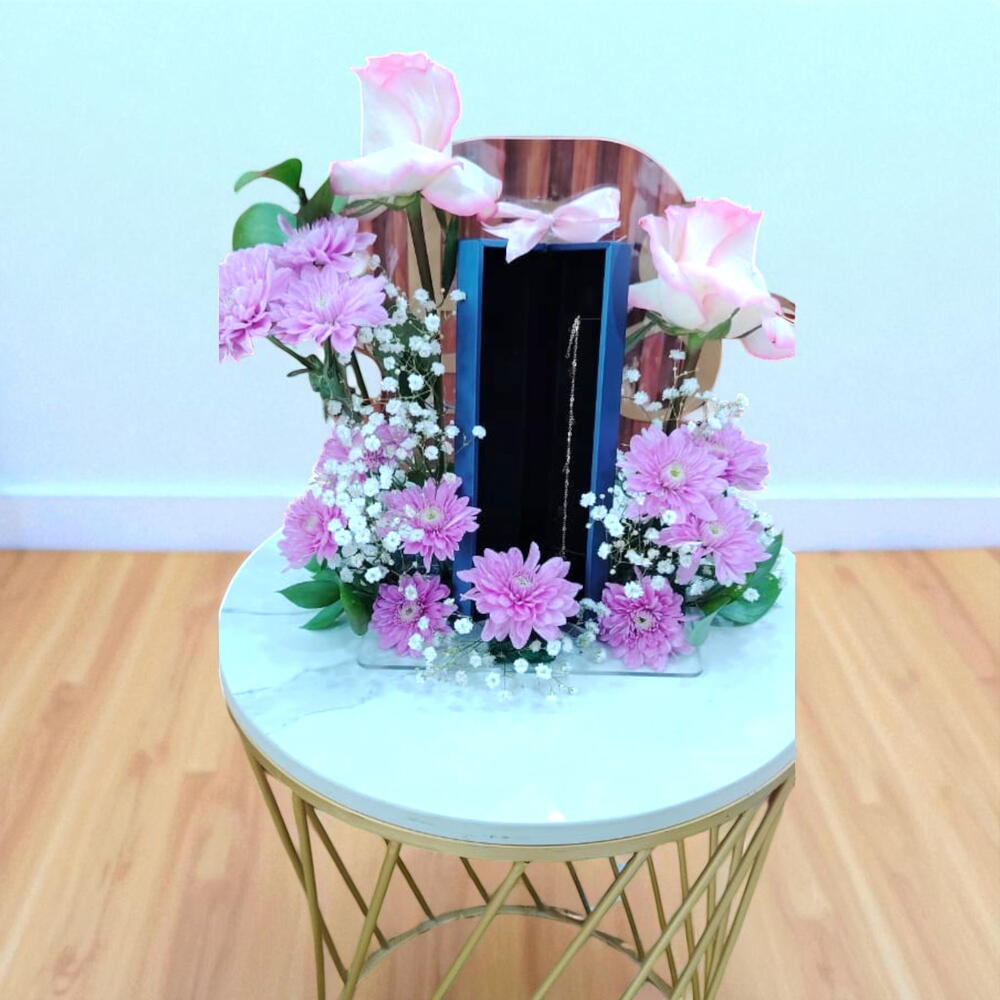 1 soporte de acrílico 2 tallos de crisantemo 2 rosas rosa claro 2 tallos de Gibson blanco 3 ruscos individuales 1 caja para pulsera (solo como referencia, no incluye joyas)
