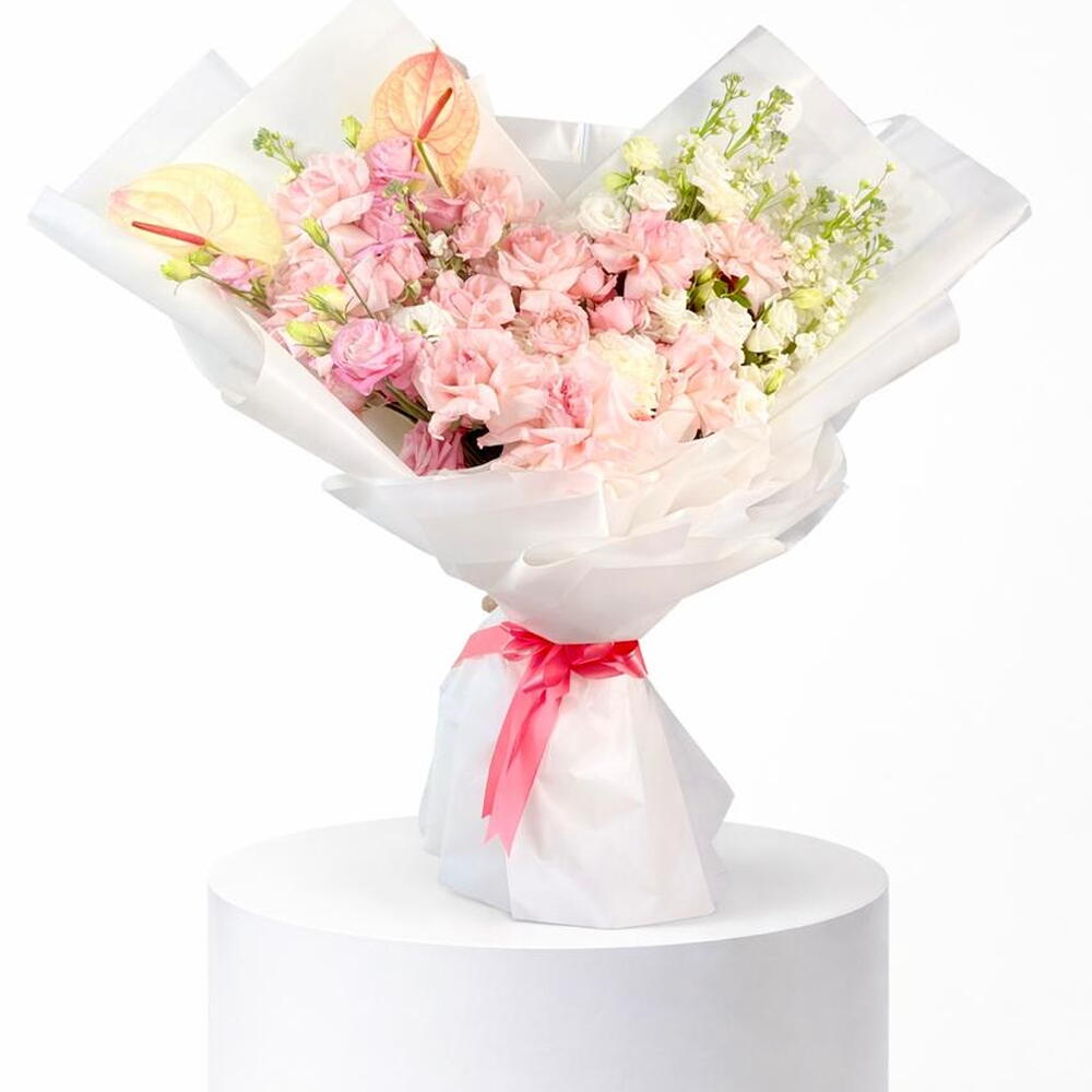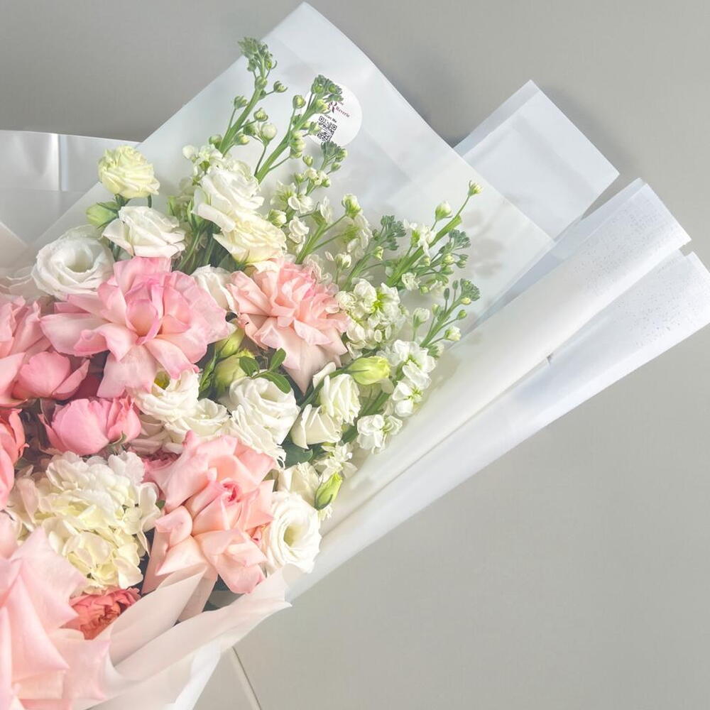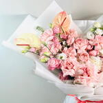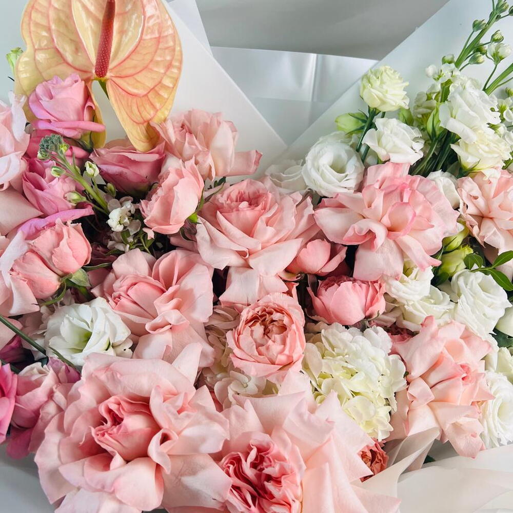 Anthurium - 2 ud. hydrangea white - 1 ud. lisianthus white - 5 ud. lisianthus pink - 5 ud. ohara rosa - 10 ud. matthiola blanca - 10 ud. julieta melocotón - 5 ud.