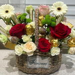 Indulge in a vibrant blend of colors and flavors with our stunning composition of Flowers in a Basket. Each basket is lovingly crafted with a selection of 15 lush mixed roses, artfully paired with 5 exquisite white Gerberas and 6 charming Green Buttons. This natures palette is tastefully complemented by 15 luxury chocolates. The perfect way to express your sentiments on any occasion, this basket serves as both a visual feast and a delectable treat.