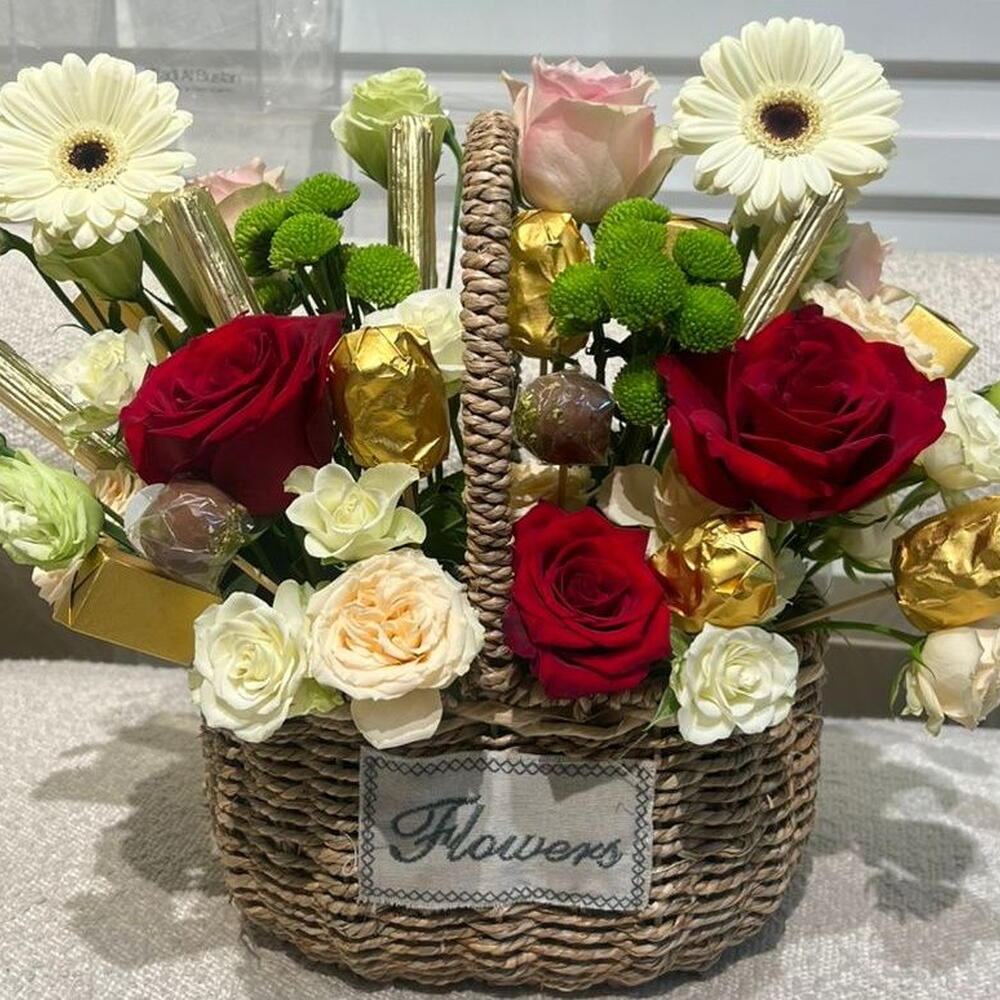 Indulge in a vibrant blend of colors and flavors with our stunning composition of Flowers in a Basket. Each basket is lovingly crafted with a selection of 15 lush mixed roses, artfully paired with 5 exquisite white Gerberas and 6 charming Green Buttons. This natures palette is tastefully complemented by 15 luxury chocolates. The perfect way to express your sentiments on any occasion, this basket serves as both a visual feast and a delectable treat.