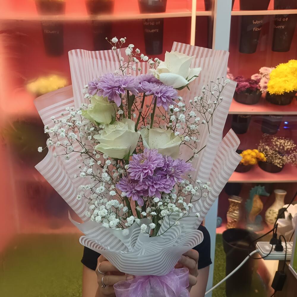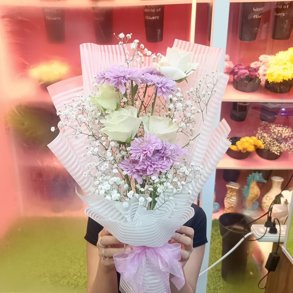 Este espléndido Mono Bouquet es una auténtica belleza, hábilmente compuesto por 2 impresionantes tallos de crisantemo y 4 rosas sumptuosas. El ramo está delicadamente complementado con un solo tallo de gipsofila, añadiendo un toque exquisito de gracia. Para realzar aún más su belleza, está elegantemente envuelto en 4 piezas de papel de alta calidad y rematado con una encantadora cinta de satén. Perfecto para cualquier ocasión, este ramo encarna romance, elegancia y belleza atemporal.