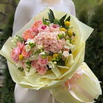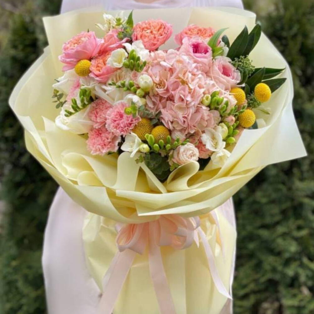 La cinta - 1 ud. Eucalyptus - 1 ud. Hydrangea - 1 ud. Freesia - 5 ud. Wrapping - 7 ud. skimmia - 1 ud. dianthus - 5 ud. craspedia - 6 ud. rose white ohara - 3 ud. rosa en aerosol julieta melocotón - 2 ud. rosa spray madame bombastic - 2 ud. rosa Pink O'Hara - 2 ud.