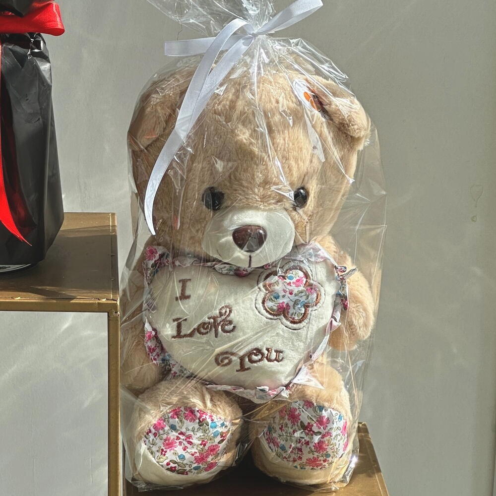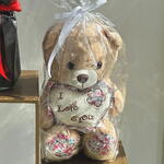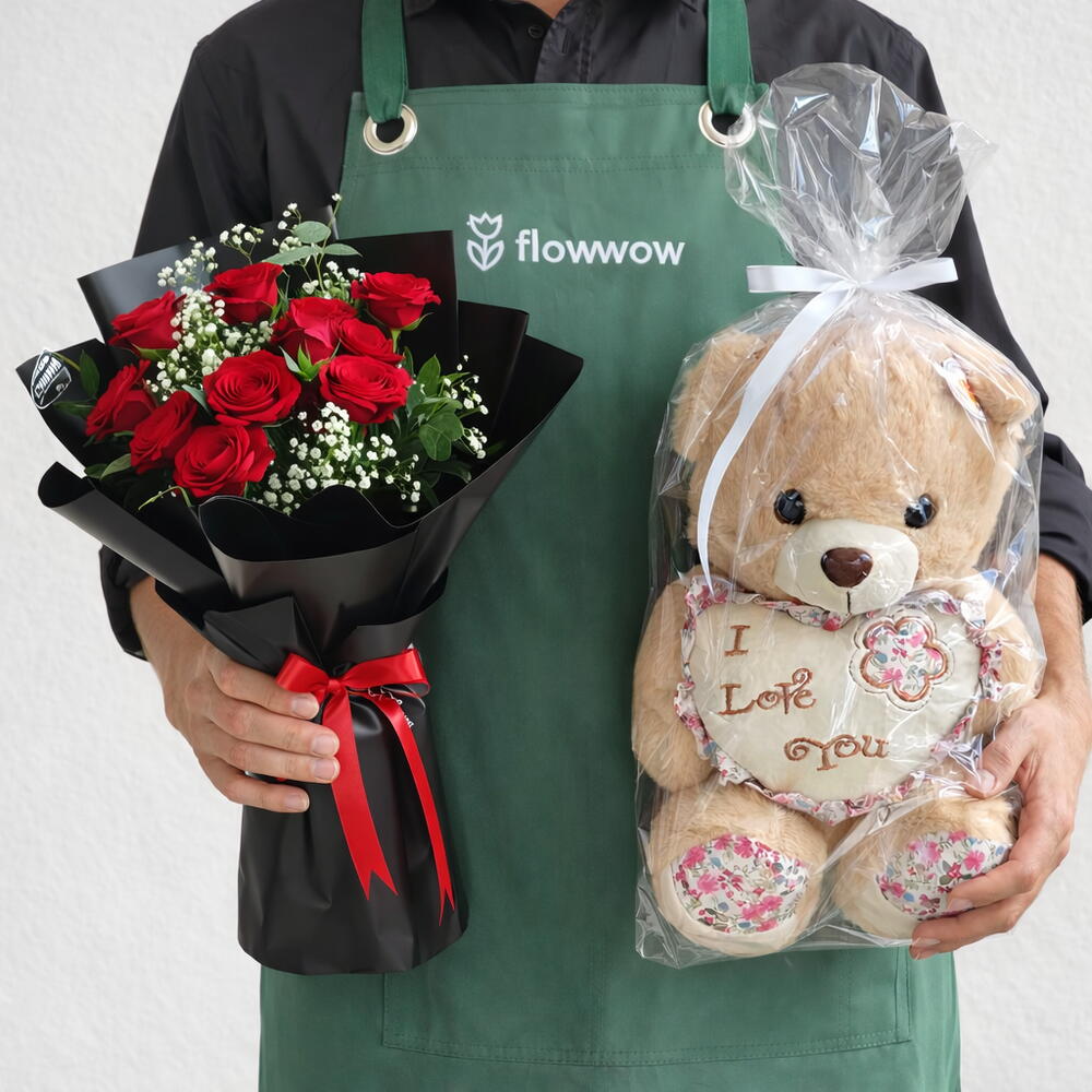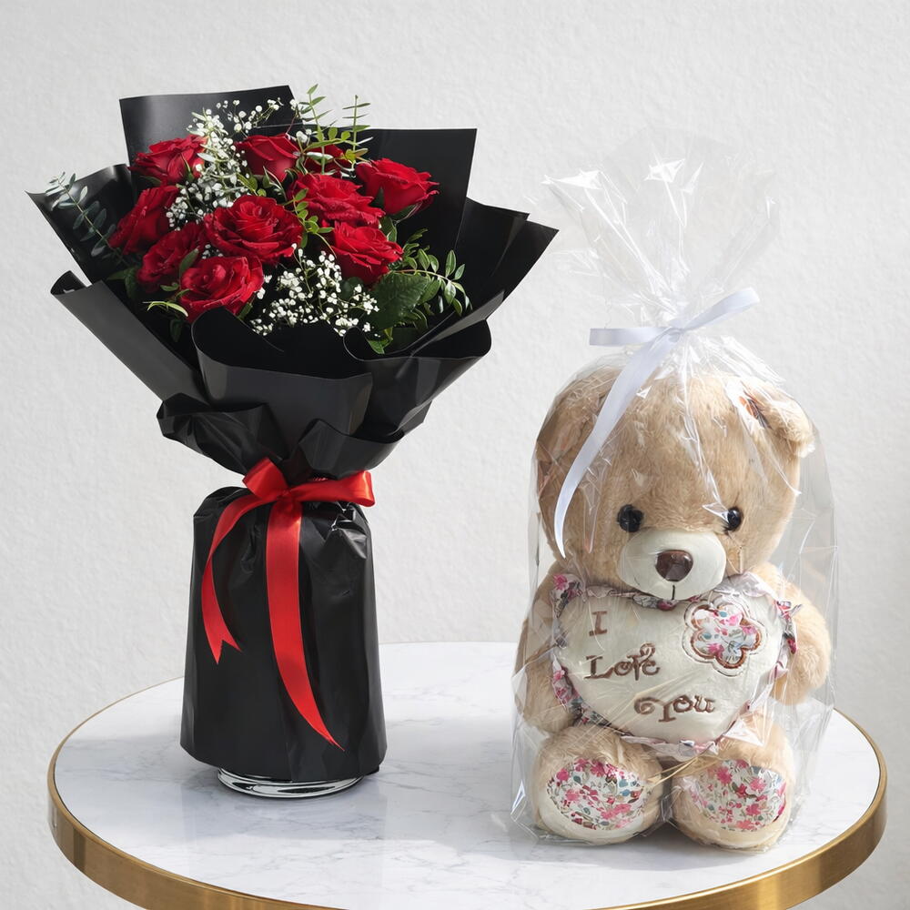 Red rose - 11 ud. Eucalyptus - 2 ud. Gypsophila - 3 ud. Teddy bear - 1 ud.