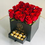 16 tallos de rosas rojas y 16 unidades de Ferrero Rocher en una caja negra