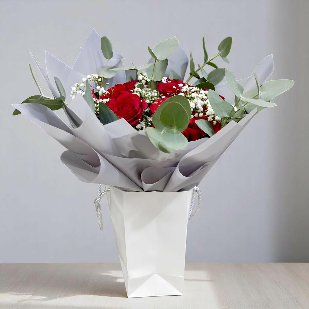 Red rose - 14 ud. Gypsophila - 5 ud. eucalipto - 6 ud.