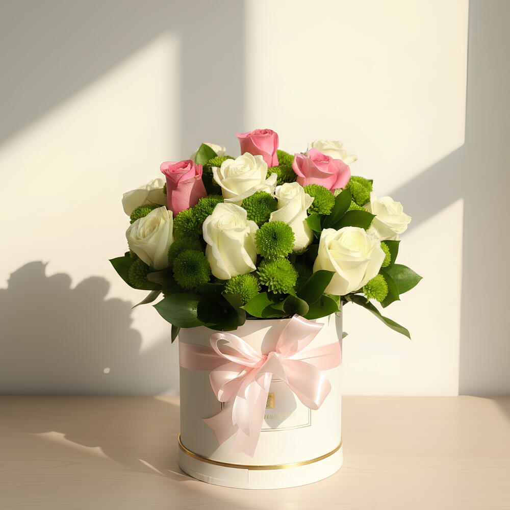 Soft Harmony is a delicate and well-balanced floral arrangement presented in a stylish hat box. Creamy white roses paired with gentle pink accents create a calm and elegant mood, while fresh green chrysanthemums add texture and natural freshness. Finished with lush greenery and a soft satin ribbon, this arrangement is perfect for birthdays, thank-you gifts, anniversaries, or refined everyday surprises.