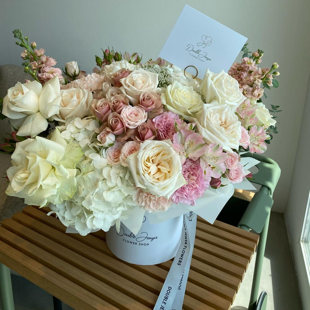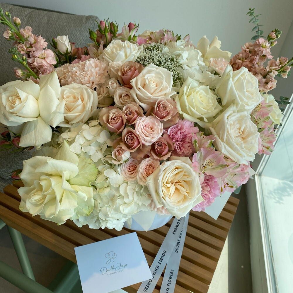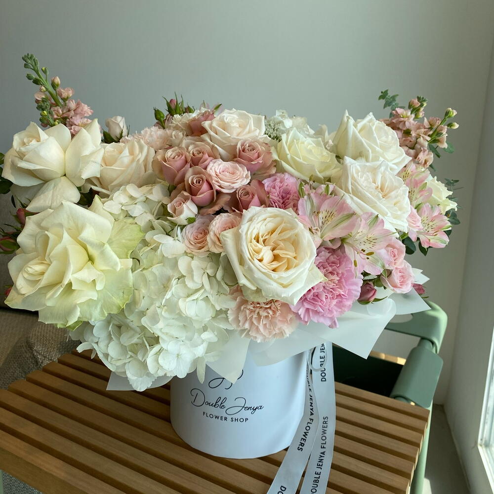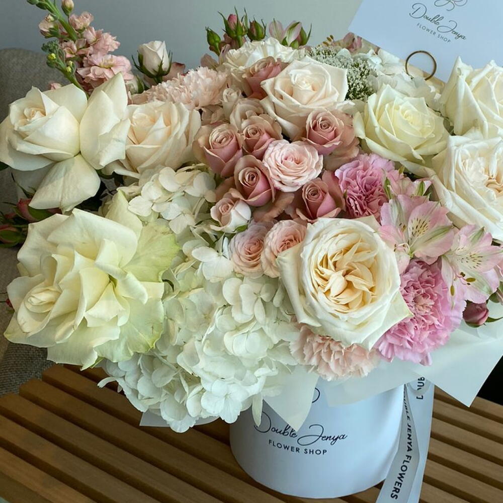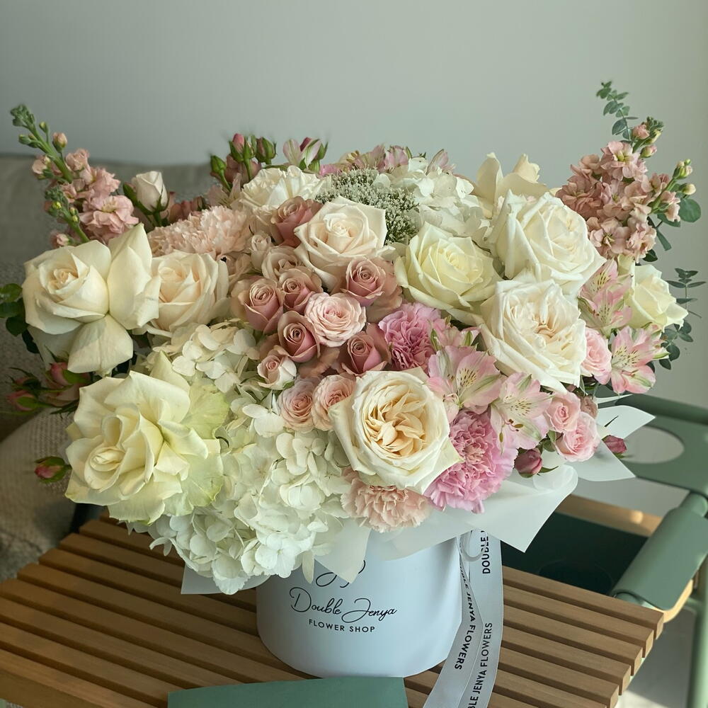 Eucalyptus - 4 ud. Spray rose - 7 ud. Hydrangea - 2 ud. Alstroemeria - 4 ud. vendella - 3 ud. carnation - 7 ud. matthiola - 4 ud. Atenea - 7 ud. ohara rose - 4 ud.
