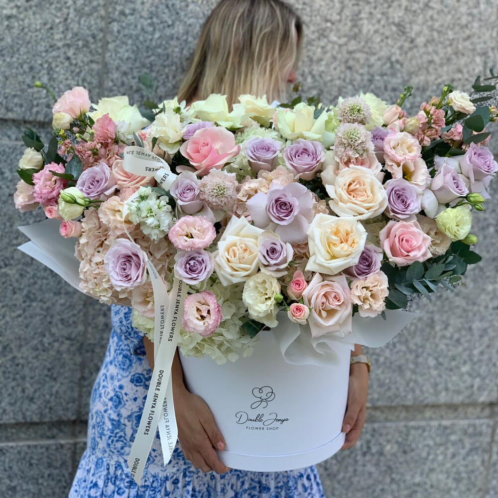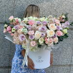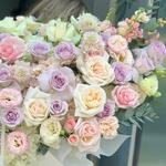 Eucalyptus - 7 ud. Spray rose - 15 ud. Hydrangea - 5 ud. Pistacia - 5 ud. Lisianthus - 10 ud. rose - 25 ud. scabiosa - 3 ud. matthiola - 10 ud. ohara rose - 5 ud.