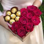 Composition: rose red - 9, chocolate candies Ferrero Rocher - 8, box - 1, Oasis - 1 Sizes: WIDTH - 20CM; HEIGHT - 9CM; LENGTH - 20CM; (including packaging) Размер: 20 x 9 x 20 см
