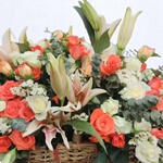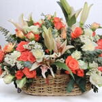 Esta impresionante cesta de flores rebosa encanto y elegancia, combinando tonos naranja cálidos y cremas suaves para una composición vibrante pero apacible. Perfecta para celebraciones, regalos de agradecimiento o simplemente para alegrar un espacio, causa una impresión duradera. Para mantenerla fresca, colócala en un lugar fresco, alejada de la luz solar directa y rocía las flores ligeramente cada día. Evita colocarla cerca de frutas en proceso de maduración, ya que emiten etileno que puede acortar la vida de las flores.
