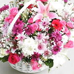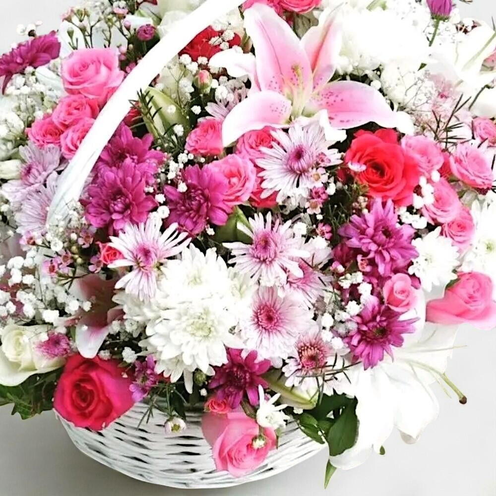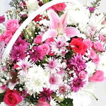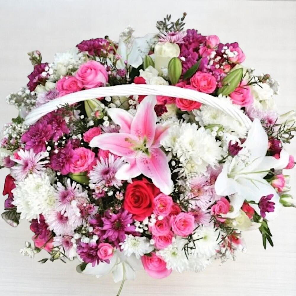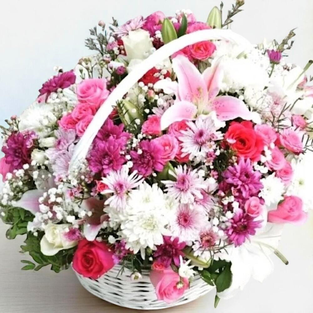 Una elegante y grácil canasta floral que rebosa de encanto y feminidad. Este arreglo combina delicados lirios rosas, crisantemos rosas y blancos brillantes, rosas románticas y ramitas de gitano, todo ello dispuesto en una clásica canasta de mimbre blanca. La mezcla de texturas y suaves tonos pastel la convierte en un regalo ideal para cumpleaños, nacimientos, aniversarios o simplemente para alegrar a alguien especial. Para garantizar su durabilidad, coloque la canasta en un lugar fresco, alejada de la luz solar directa y del calor. Riegue ligeramente la espuma floral del interior cada 1 o 2 días para mantener las flores frescas y vibrantes. Retire las flores marchitas de inmediato para prolongar la vida del arreglo. Esta canasta es más que un regalo floral: es una declaración de cariño y elegancia.