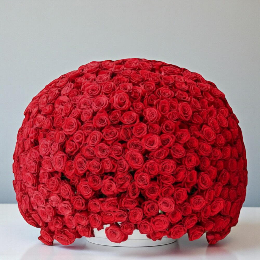Este impresionante arreglo de vibrantes rosas rojas está diseñado para hacer una declaración poderosa de amor y admiración. Con forma de cúpula perfectamente redondeada, crea un efecto visual lujoso y dramático que capta la atención de inmediato. La colocación densa de las rosas aporta a la composición una textura rica y aterciopelada y una sensación elegante y de alta gama. Este arreglo es ideal para gestos románticos, aniversarios, propuestas o celebraciones grandiosas. Colocado sobre una base estable, luce espectacular como centro de mesa o como regalo emblemático. Para mantener las flores frescas, añada agua a la espuma floral regularmente, evite la luz solar directa y coloque el arreglo en una habitación fresca alejada de fuentes de calor.