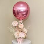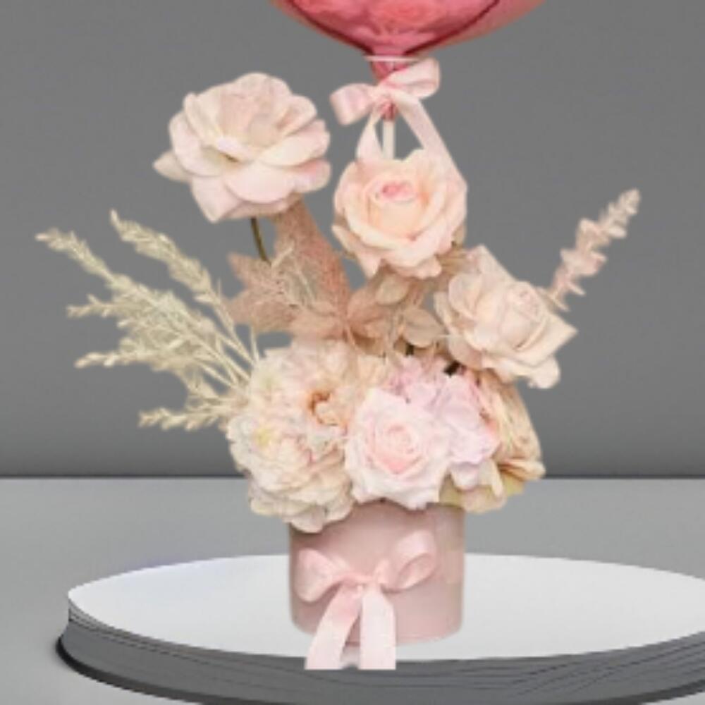 baby breath - 8 ud. flor de peonía - 1 ud. globo metalizado de cumpleaños - 1 ud. rosas blanco crema - 7 ud. hojas de eucalipto rosadas - 3 ud.