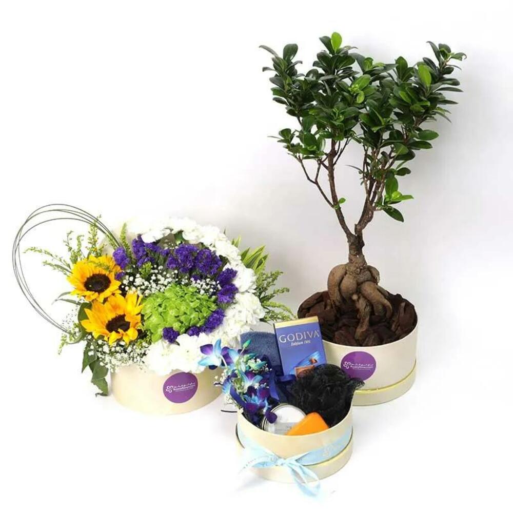 Detalles del producto: Planta bonsái en una caja Arreglo floral en una caja Cesta de regalo con chocolate, vela y jabón