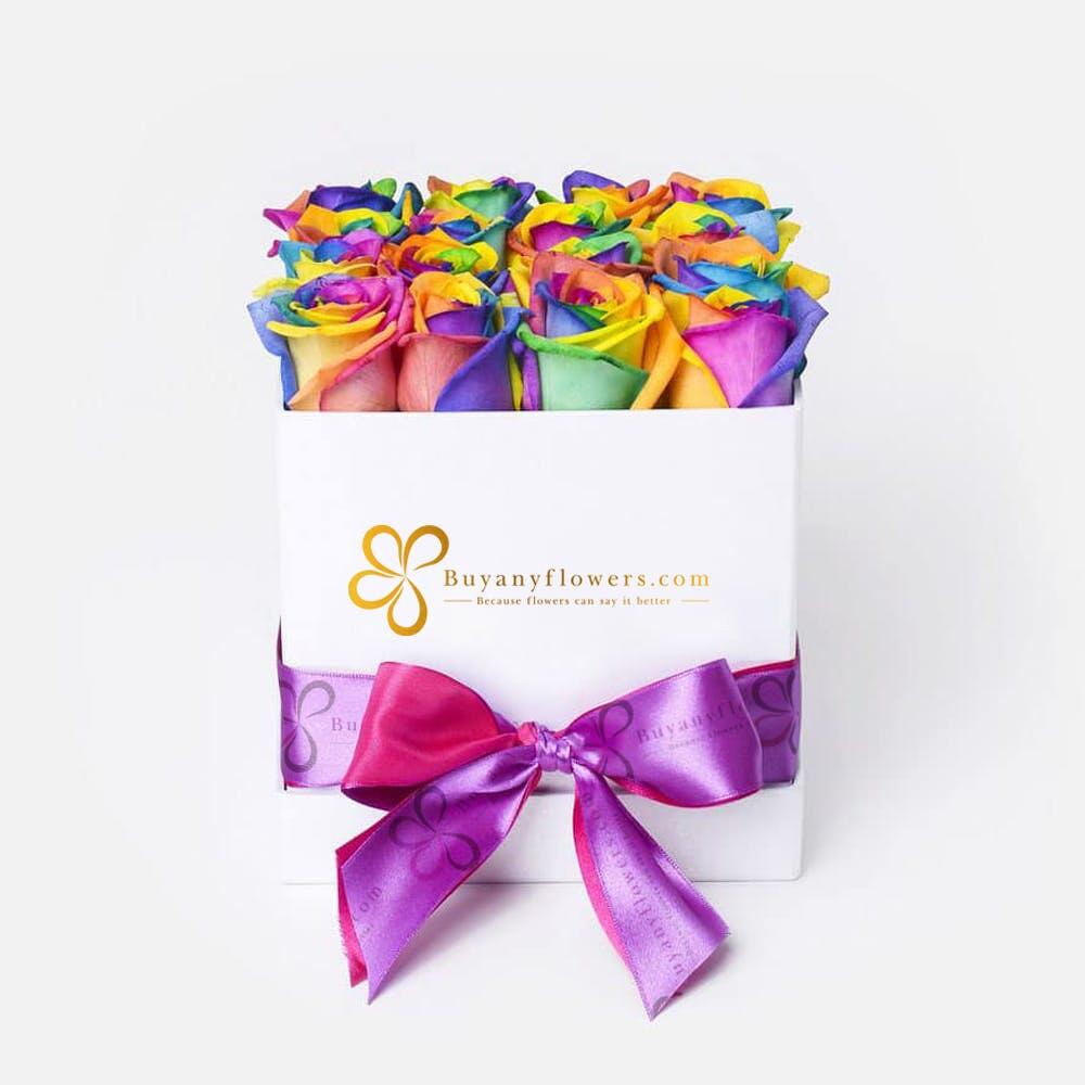 Product Details Arrangement of 20 to 22 Rainbow Forever Roses in White Box.