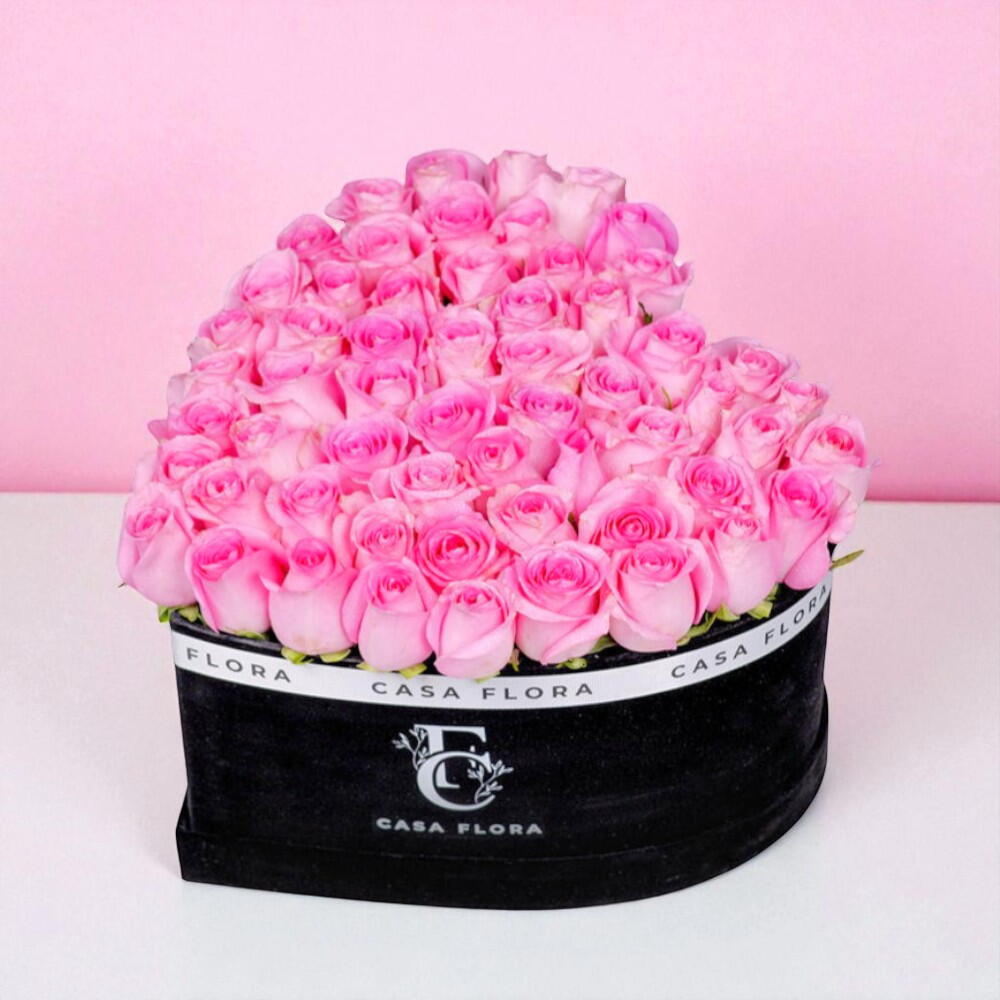 Consiéntase con el máximo gesto de amor con esta exquisita caja en forma de corazón, llena de frescas y vibrantes rosas rosas. Cada flor se selecciona a mano por su tono perfecto y sus pétalos impecables, creando un impresionante despliegue de elegancia y romance. Los suaves tonos rosados transmiten ternura, admiración y alegría, lo que la convierte en el regalo ideal para aniversarios, cumpleaños o cualquier otra sorpresa especial. Presentado en una lujosa caja de terciopelo negro adornada con el logotipo de Casa Flora, este arreglo irradia sofisticación y encanto. Su singular forma de corazón añade un toque de sentimiento, convirtiendo un hermoso ramo en un recuerdo especial. Perfecta para expresar emociones profundas, esta obra maestra floral dejará una huella imborrable en quien la reciba.
