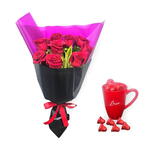 Detalles del producto: - Hermoso ramo de 9 rosas rojas y taza I Love con chocolates patchi
