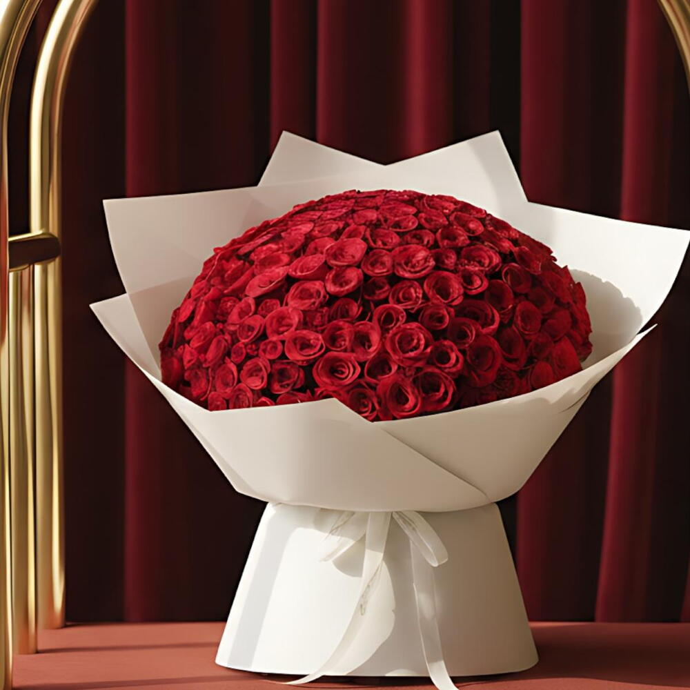 Haz la declaración romántica más grandiosa con este impresionante ramo en forma de cúpula que cuenta con 201 rosas rojas aterciopeladas. Envuelto en elegante papel blanco con una suave cinta de satén, este lujoso arreglo es la personificación de la pasión, el compromiso y un amor inolvidable.