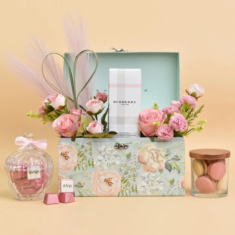 2 Claveles artificiales rosas en spray 3 Rosas artificiales rosas Cortaderia de las pampas (flores secas) 2 Rosas artificiales rosas en spray Relleno de hierba china blanca Cubos de chocolate artesanal Macarons (150 g) Perfume Burberry Touch Presentado en una elegante caja de diseño