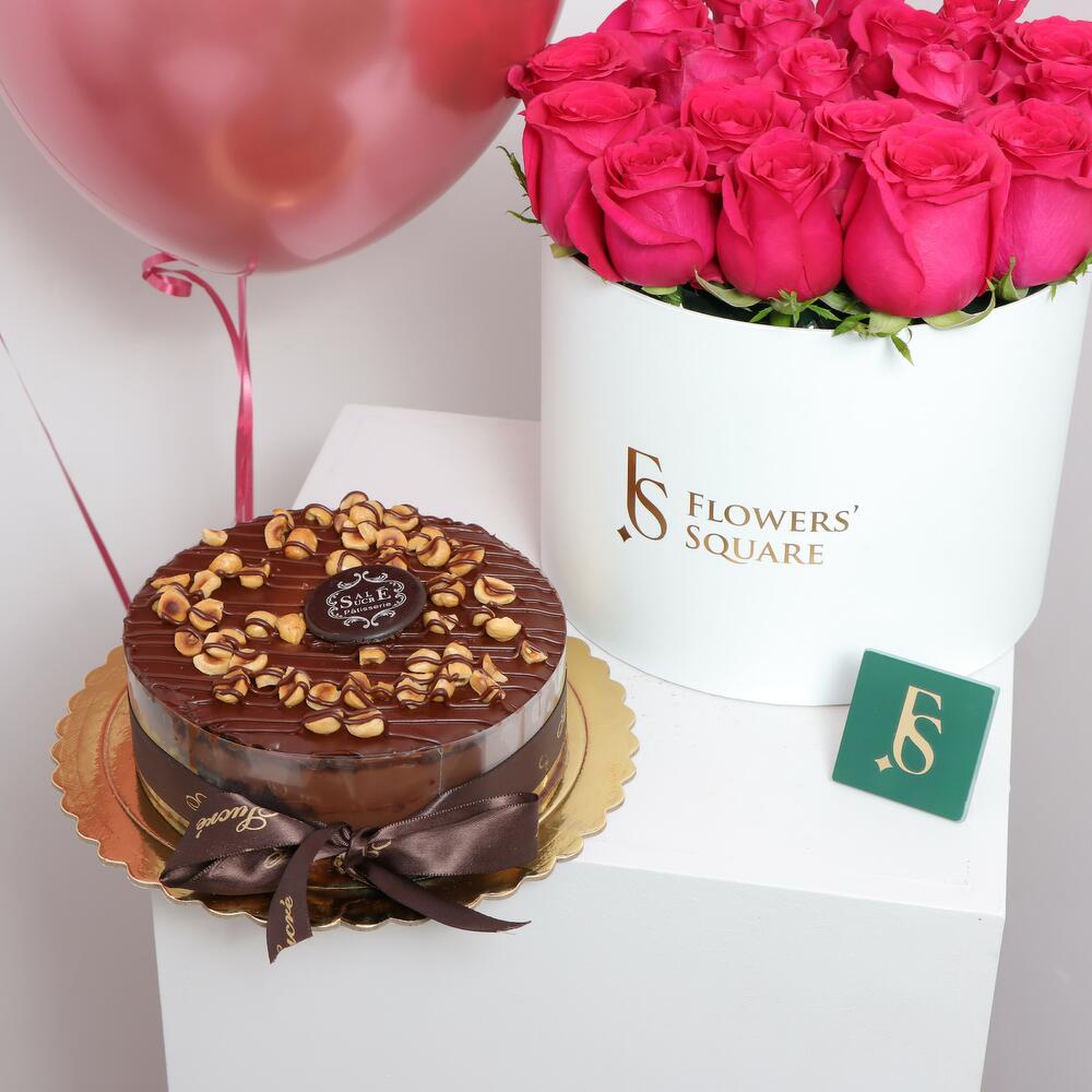 ¡Sorprende a tus seres queridos con nuestro paquete de valor especial! Nuestra caja fucsia rosa, la tarta fudge de avellana y 3 globos rosa bronce seguramente harán que tu ocasión especial sea inolvidable. Elaborada con los mejores ingredientes, el sabor dulce y cremoso de la tarta fudge de avellana deleitará tu paladar, mientras que los globos de helio plateados crean una atmósfera etérea. Permítenos hacer que tu celebración sea memorable.