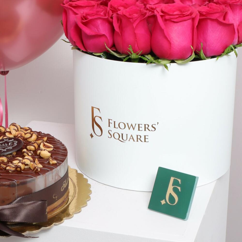 Caja de rosas fucsia, pastel y globos