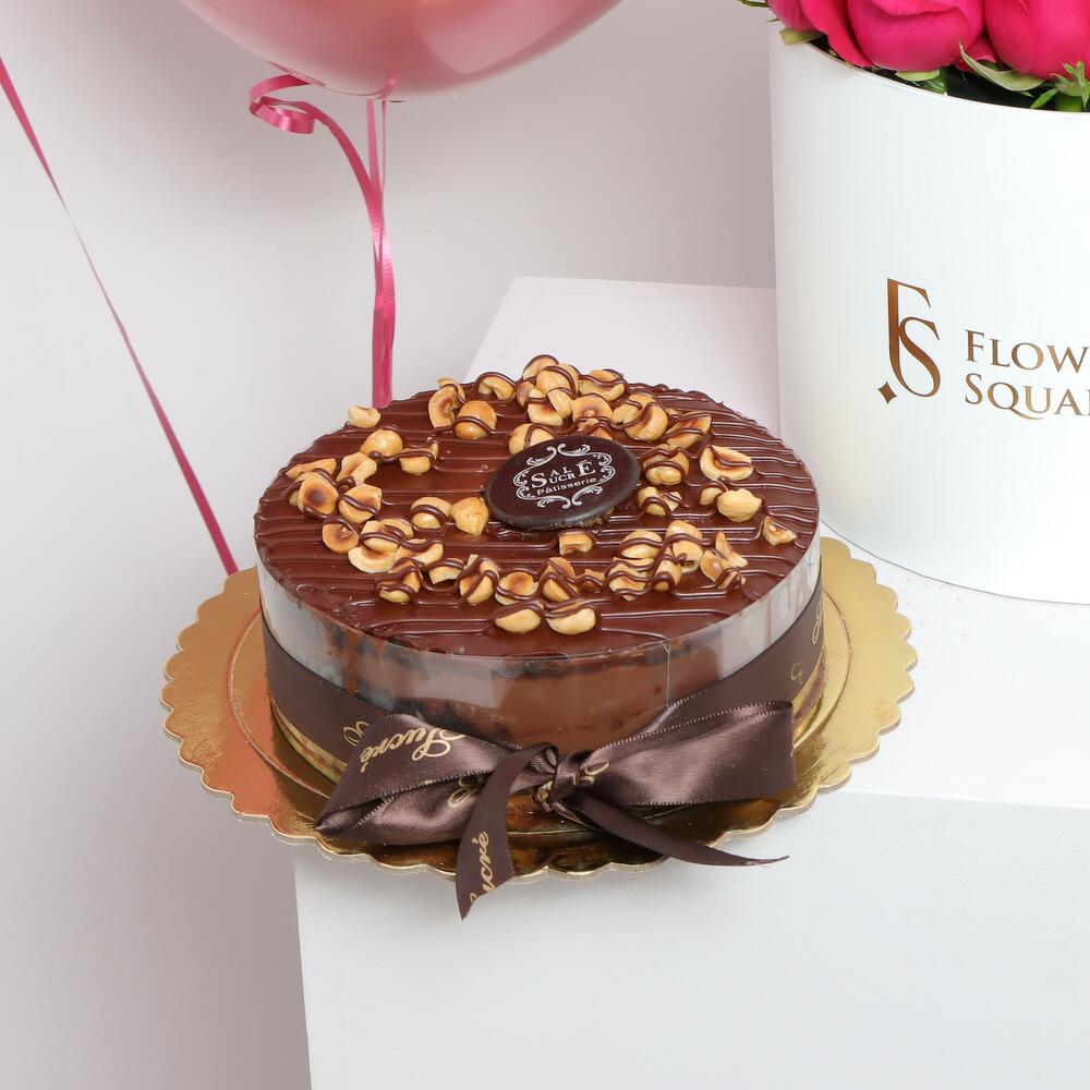 Pink rose - 20 ud. globos de helio de gran tamaño color rosa bronce - 3 ud. pastel de fudge de avellana 750 gramos(6-8 personas) - 1 ud.