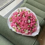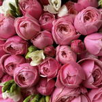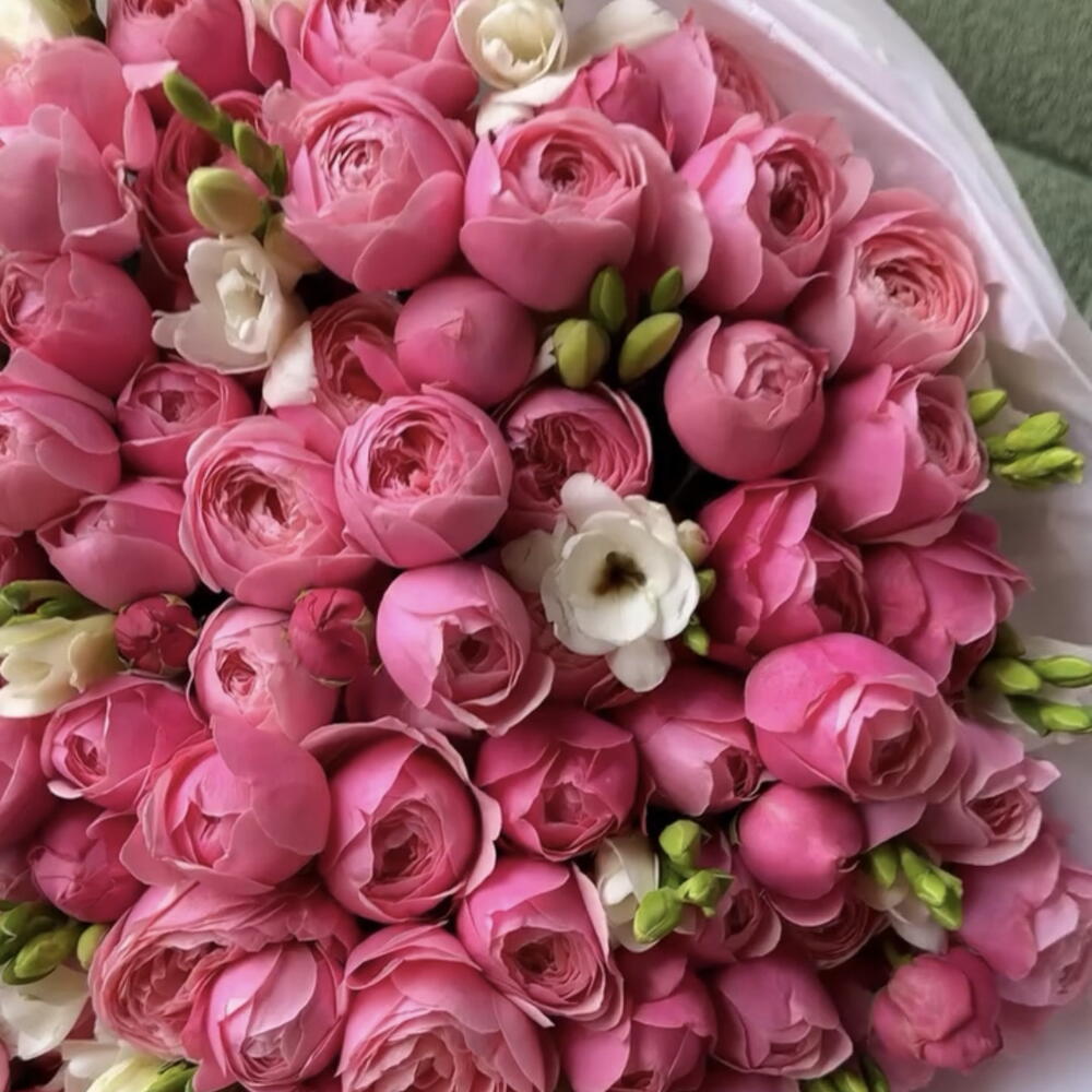 Un ramo delicado y aireado en exuberantes tonos de rosa — una verdadera expresión de romanticismo y elegancia. Las exuberantes rosas en spray de estilo jardín crean un aspecto suave y voluminoso, mientras que la freesia blanca aporta un contraste refinado y una fragancia sutil y hermosa.