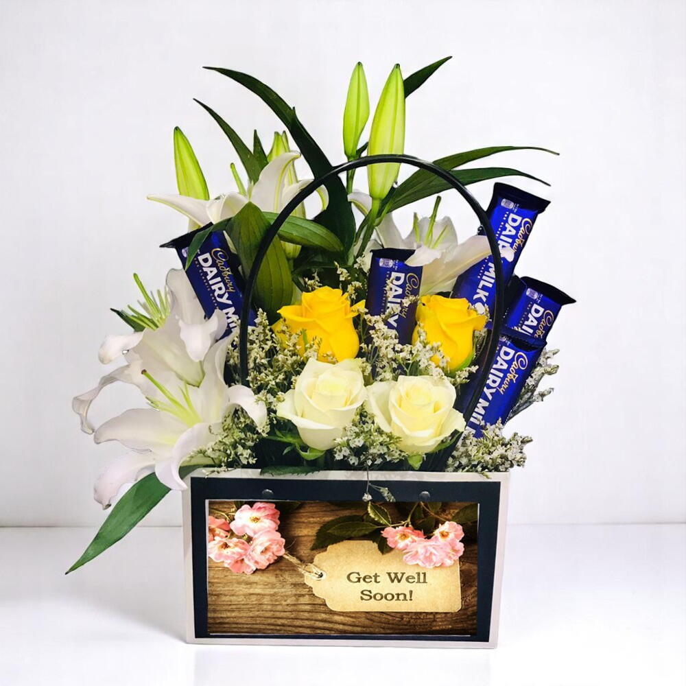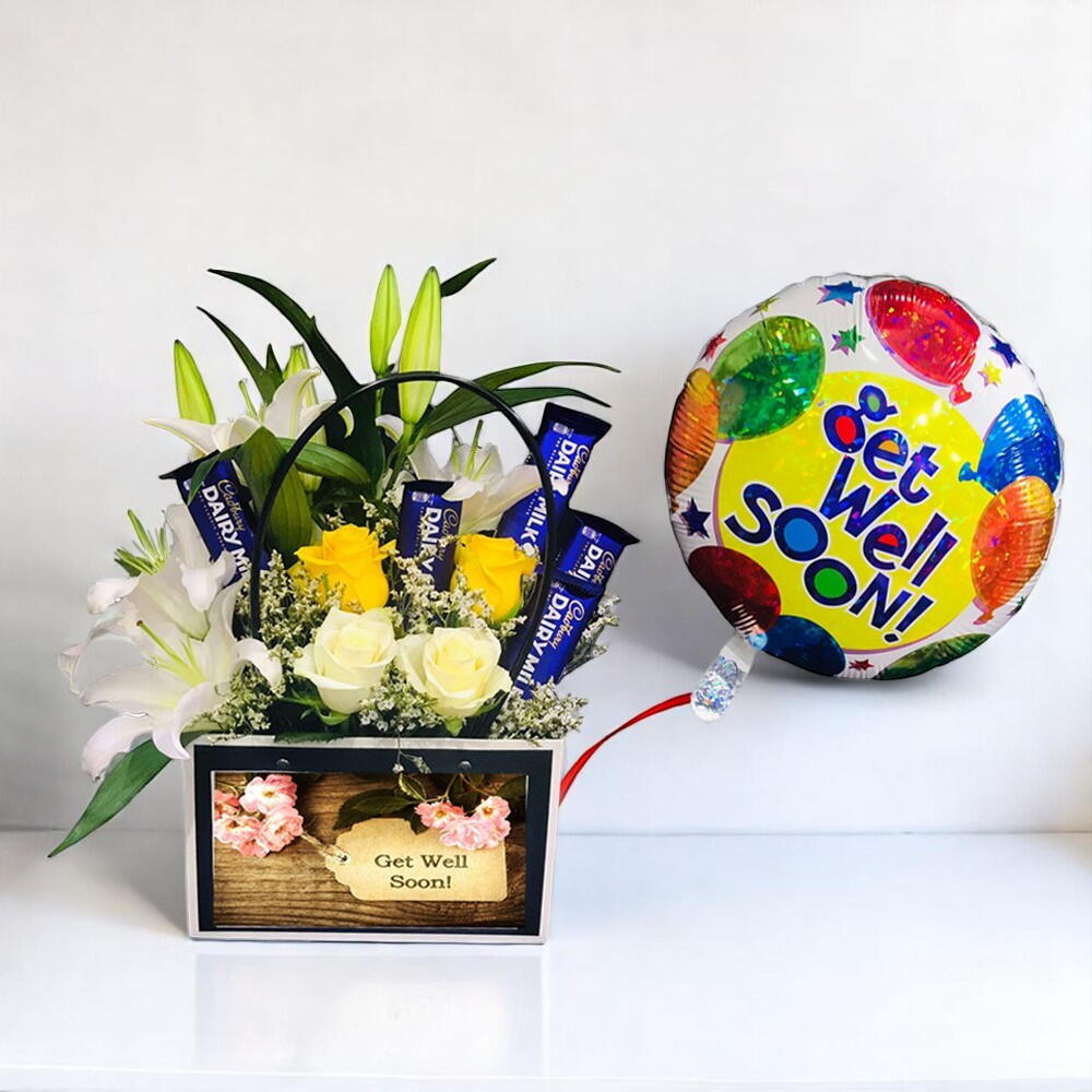 Envía pensamientos de sanación y dulce consuelo con la Bolsa de Regalo "Mejórate Pronto", un alegre y alentador arreglo floral acompañado de deliciosos chocolates y un vibrante globo metálico. Diseñado cuidadosamente para traer sonrisas y levantar el ánimo, este regalo incluye una encantadora combinación de frescas rosas amarillas y blancas, elegantes lirios blancos y exuberante vegetación, complementada con cremosas barras de Dairy Milk para una dulce sorpresa. Un globo metálico "Mejórate Pronto" añade el toque perfecto de calidez y ánimo para ayudar a alguien a sentirse mejor, más rápido. Instrucciones de cuidado: Mantenga las flores en un lugar fresco, lejos de la luz solar directa y fuentes de calor. Los globos suelen mantenerse a flote de 6 a 8 horas, dependiendo de la temperatura ambiente. Los chocolates deben conservarse en un lugar fresco y a la sombra para mantener su frescura.