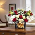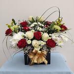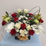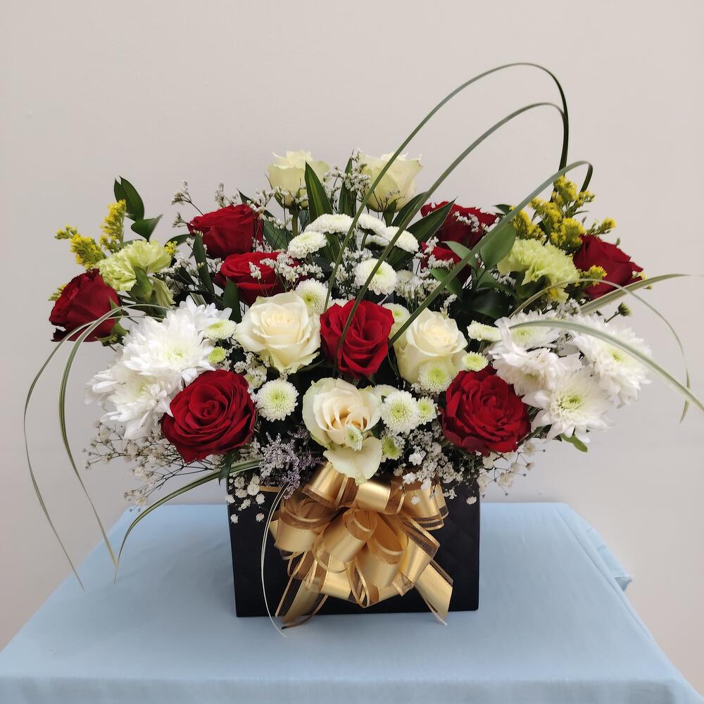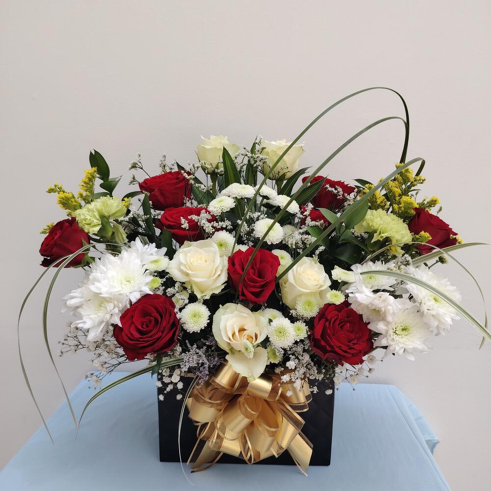 Red rose - 10 ud. White rose - 5 ud. Gypsophila - 5 ud. carnation - 3 ud. crisantemo blanco - 5 ud. labios totalmente verdes - 10 ud. color de caja personalizada - 1 ud.