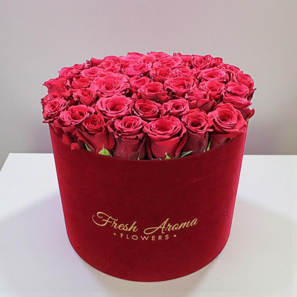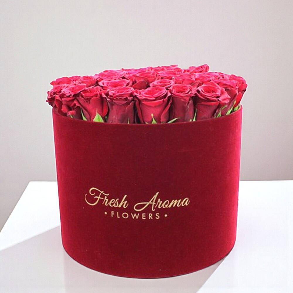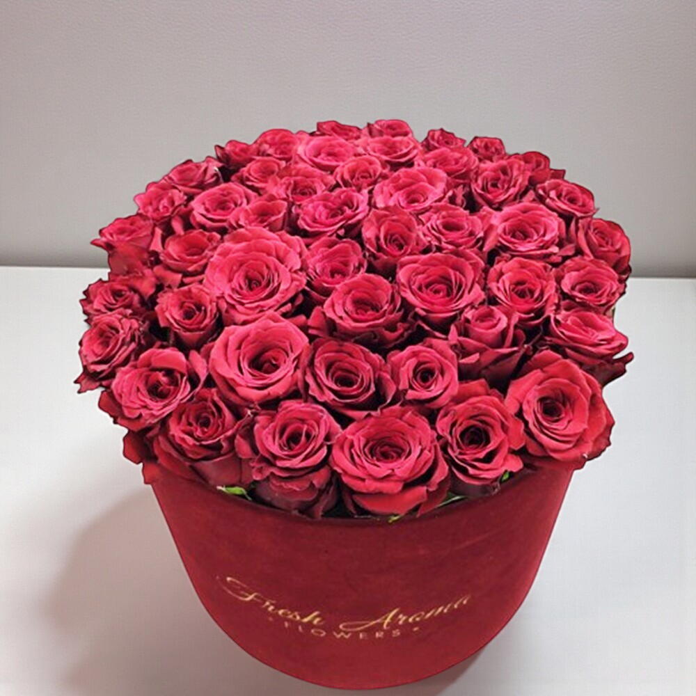 Este elegante arreglo en caja sombrerera de rosas rojas es la definición de lujo refinado y romance moderno. Docenas de flores perfectamente formadas están colocadas muy juntas, creando una superficie lisa y aterciopelada, rica en color y textura. Los profundos tonos carmesí simbolizan la pasión, la confianza y el amor eterno. Una elegante caja redonda añade un toque final sofisticado y hace que el arreglo sea fácil de exhibir sin un jarrón adicional. Esta composición es perfecta para aniversarios, propuestas y regalos impresionantes y emotivos. Para mantener las rosas frescas, añade una pequeña cantidad de agua limpia directamente en la espuma floral dentro de la caja cada día. Mantén el arreglo en una habitación fresca, lejos de la luz solar directa, de calentadores, de aires acondicionados y de frutas. Evita tocar los pétalos con frecuencia para preservar su forma y color.