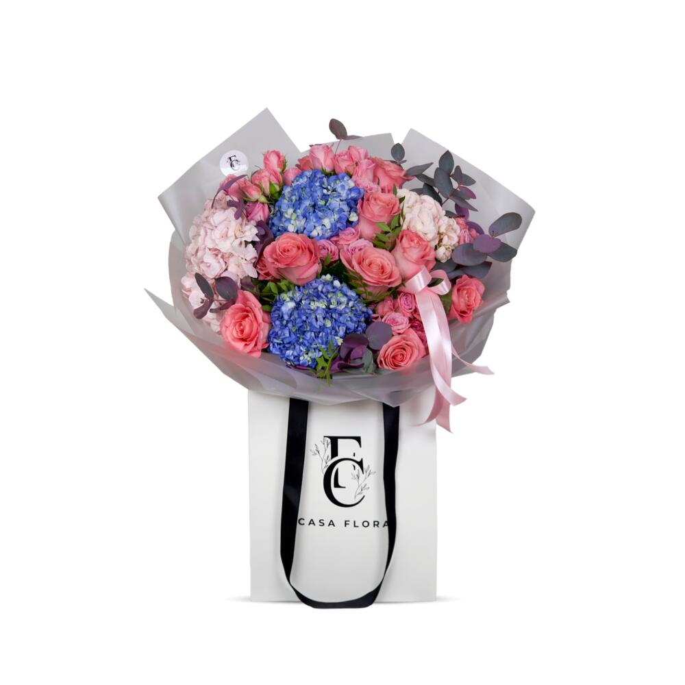 Este cautivador arreglo floral presenta una armoniosa combinación de vibrantes hortensias azules, suaves rosas rosas y delicados claveles rosa claro, acentuados con frescas hojas de eucalipto. El ramo está envuelto con maestría en papel blanco translúcido y asegurado con una lujosa cinta de satén rosa que le aporta un toque de elegancia. Se presenta en una elegante bolsa de papel blanco de Casa Flora, con elegantes asas negras que realzan su sofisticado atractivo. El arreglo descansa con gracia sobre un pedestal cilíndrico acanalado beige sobre un sencillo fondo gris, lo que permite que los vibrantes colores y texturas del ramo destaquen. En general, el ramo irradia una sensación de serena belleza y refinado encanto, perfecto para cualquier ocasión especial o como un detalle.
