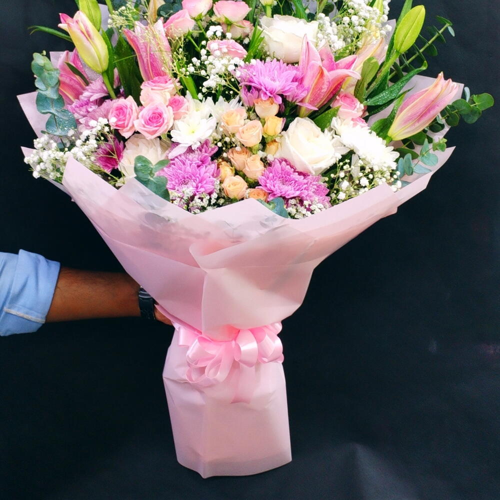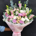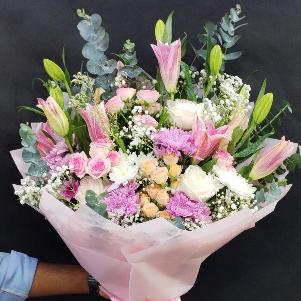Gran ramo de flores mixtas de lirio, rosa, crisantemo daysis, rosas spray.. Con bonito envoltorio lazo