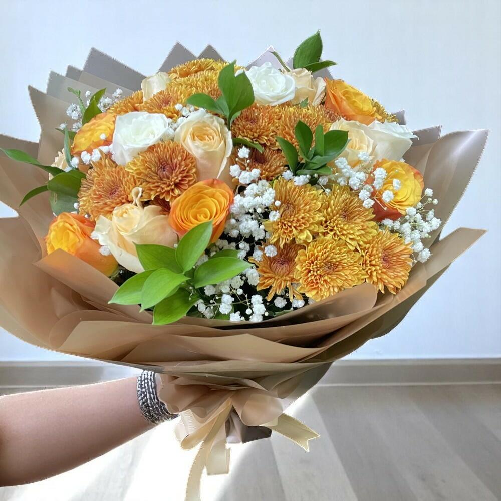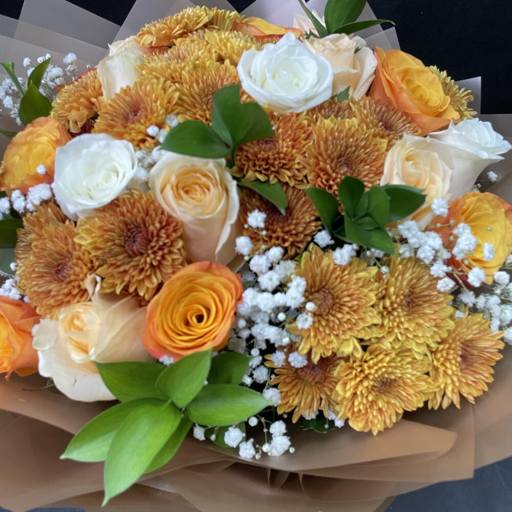 donde los tonos vibrantes de Ilex en naranja y amarillo armonizan con gracia con el atractivo Deco naranja, la aterciopelada rosa naranja Juliet y la dulce y fragante rosa Sweet Sara. Este cautivador ramo susurra una serenata de calidez y elegancia, prometiendo elevar cualquier espacio con su encanto de inspiración cítrica.